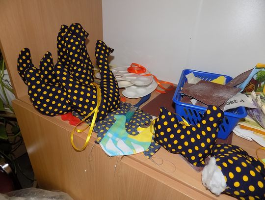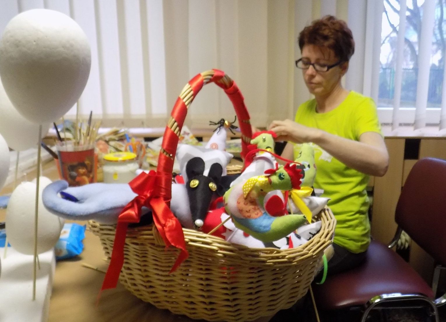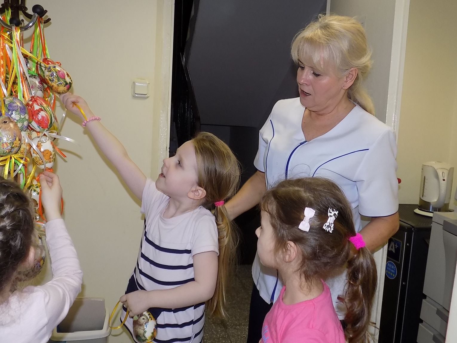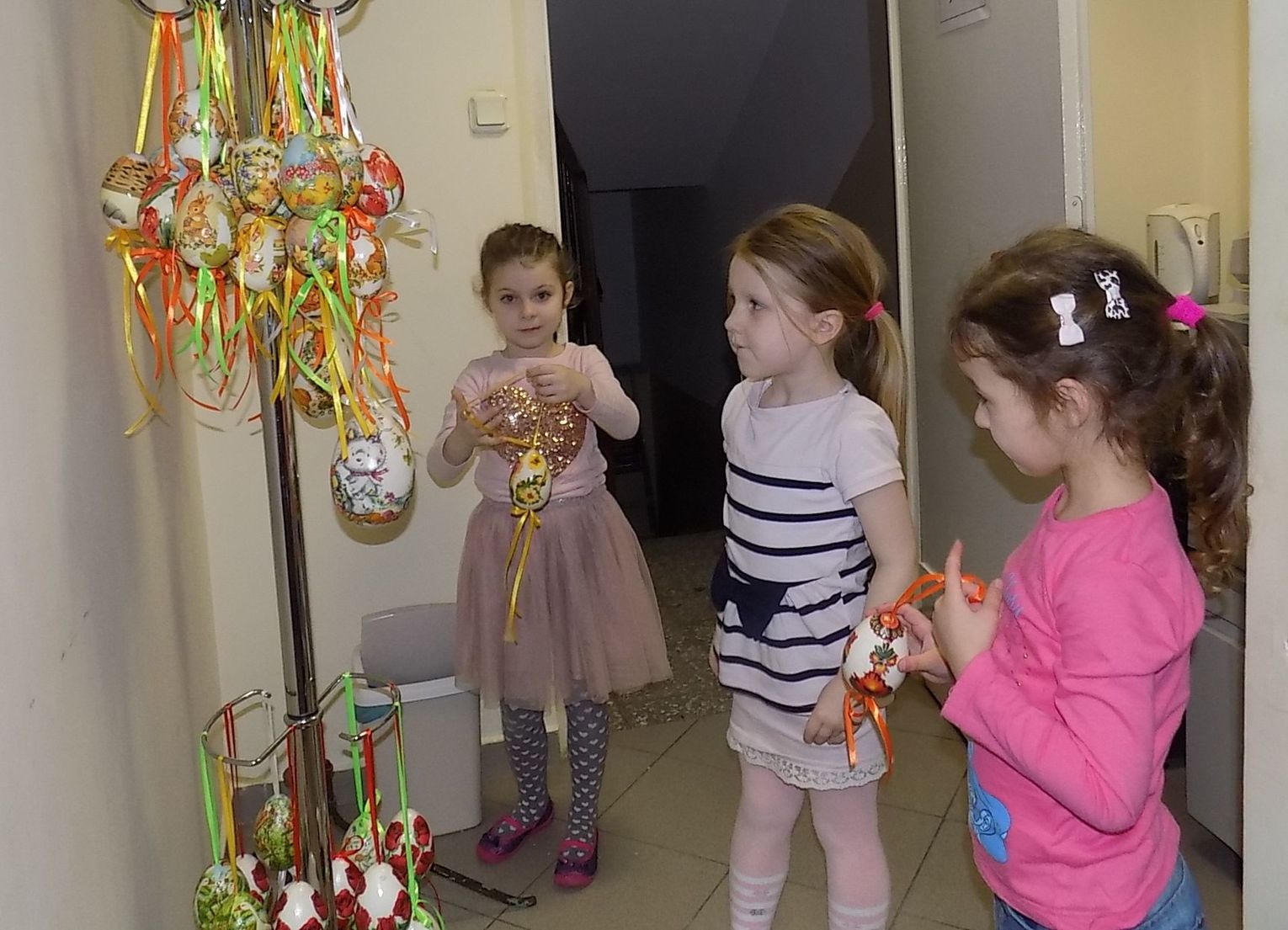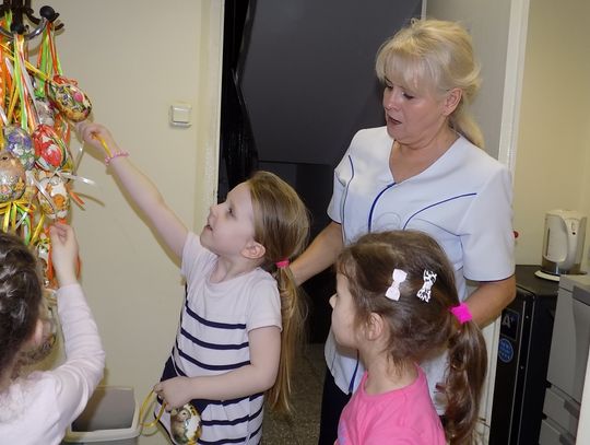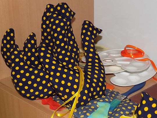 W jednej z sal poczuć się można jak w prawdziwym zakładzie produkcyjnym. Przy maszynie pani Basia szyje ubranka dla kur. Pani Teresa Staszak - oprócz czuwania nad dobrym samopoczuciem maluchów - razem z dziećmi wybiera i rozdziela kolorowe serwetki, którymi następnie oklejane są duże jajka, zamieniane w śliczne kolorowe pisanki.