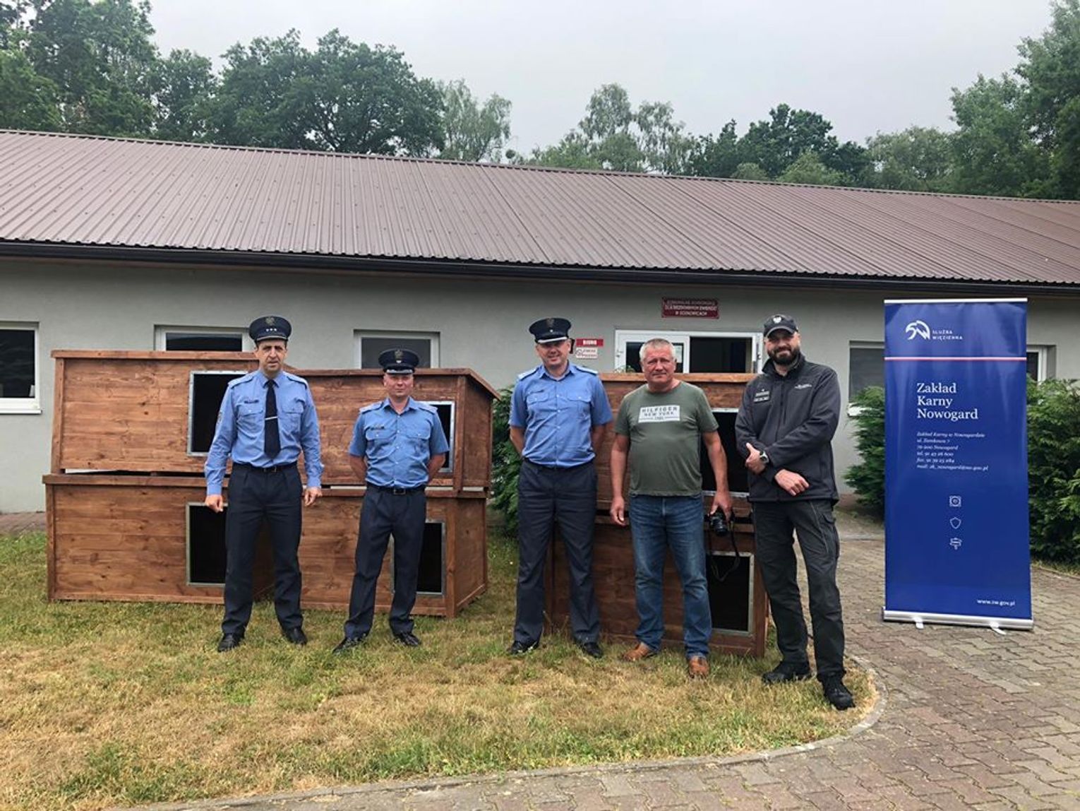 W związku z powyższym w maju kierownictwo Komunalnego Schroniska dla Bezdomnych Zwierząt z siedzibą w Sosnowicach zwróciło się do Dyrektora Zakładu Karnego w Nowogardzie z prośbą o wykonanie kilku bud dla psiaków ze schroniska. Odpowiedź mogła być tylko jedna – oczywiście pomożemy. W efekcie powstało 6 solidnych i funkcjonalnych bud wykonanych zgodnie z projektem przesłanym przez kierownictwo schroniska. Przekazanie ich przez delegację funkcjonariuszy z ZK Nowogard było prawdziwą przyjemnością.