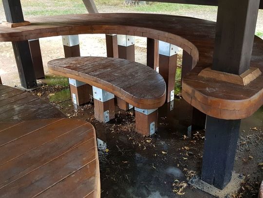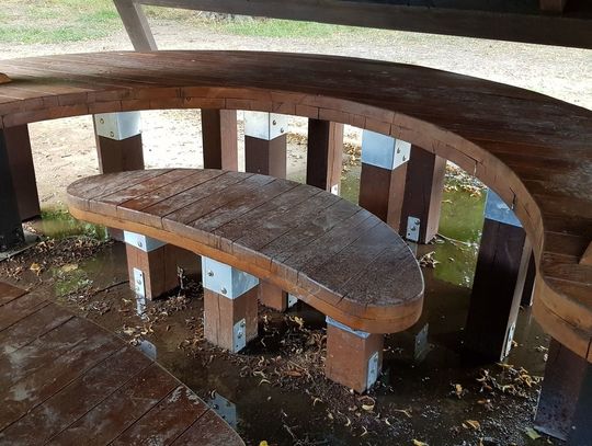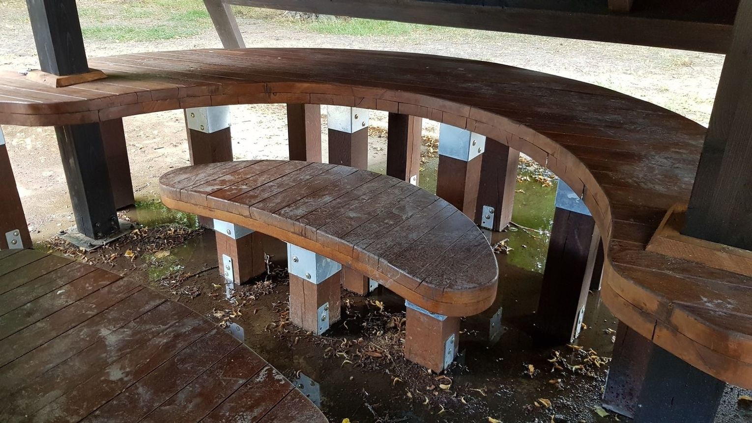 Jak widać na zdjęciach, posadzka wiaty jest prawdopodobnie źle wyprofilowana. Po deszczu zbiera się tam bowiem woda. Doprowadziło to do tego, że chociaż wokół wiaty jest już sucho, to my siedzimy nogami w kałuży.