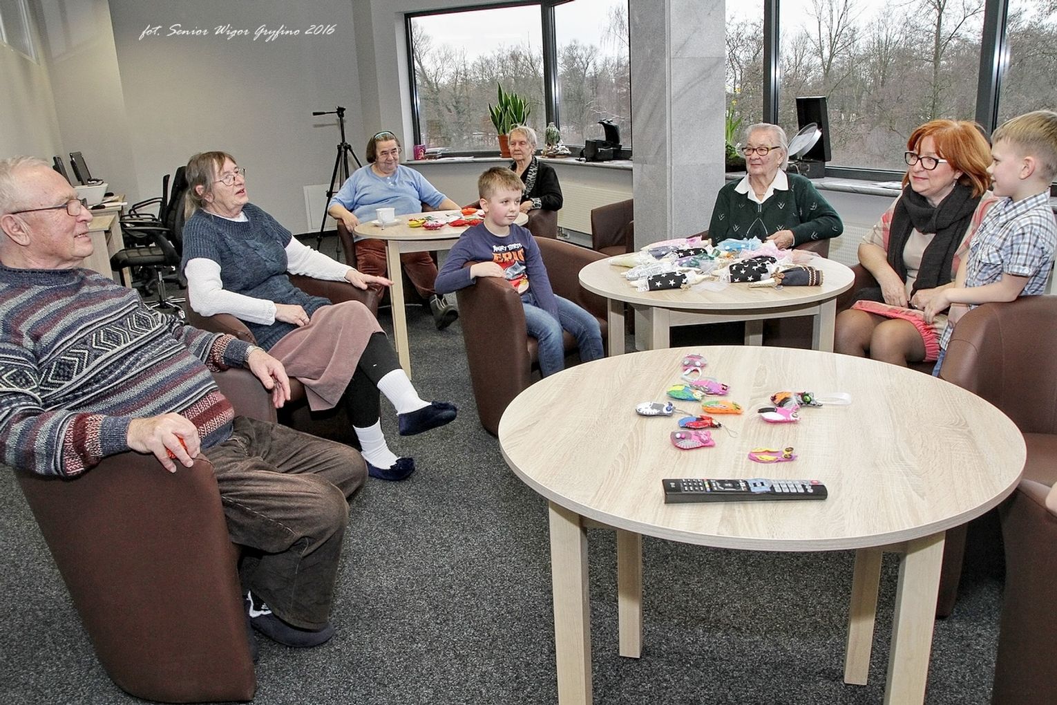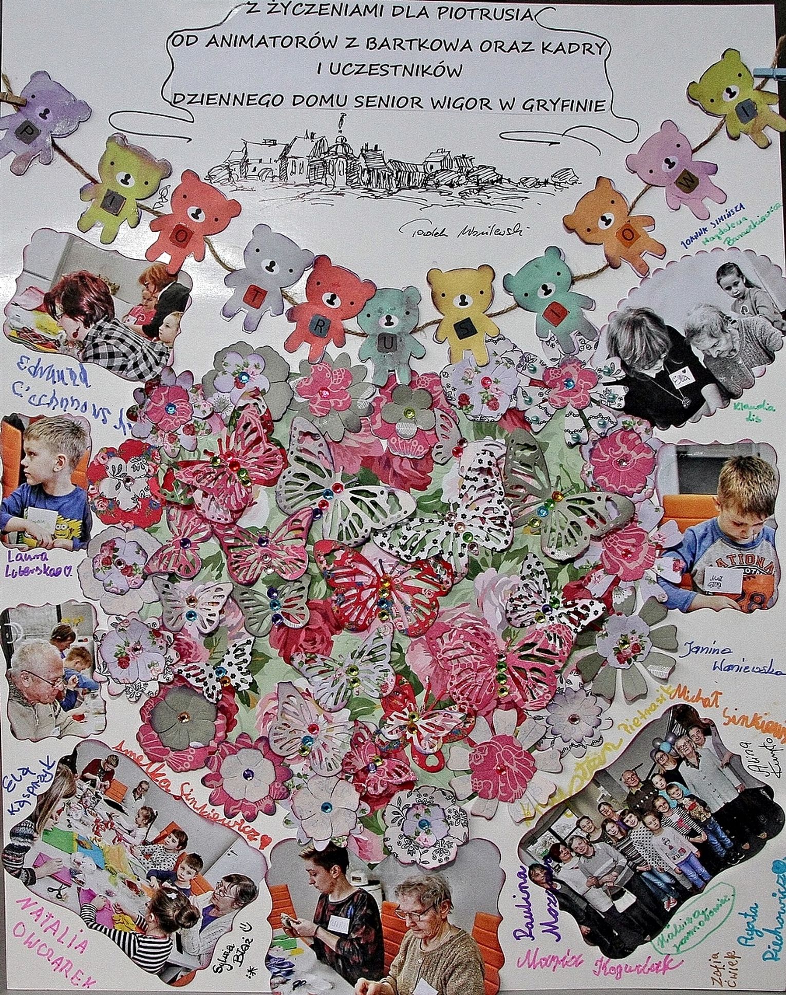 prawda bardzo skromnie, ale za to z sercem. Podczas niedawnych warsztatów integracyjnych, w których oprócz gospodarzy i kadry gryfińskiego Senior Wigor udział wzięli animatorzy z Bartkowa, powstała praca zbiorowa w postaci okolicznościowej kartki z życzeniami dla Piotrusia. Zostanie ona przekazana w najbliższych dniach przy okazji wizyty mamy chłopca w Dziennym Domu Senior Wigor w Gryfinie.