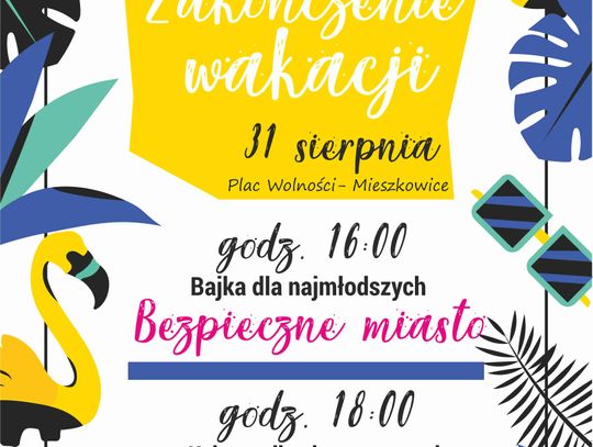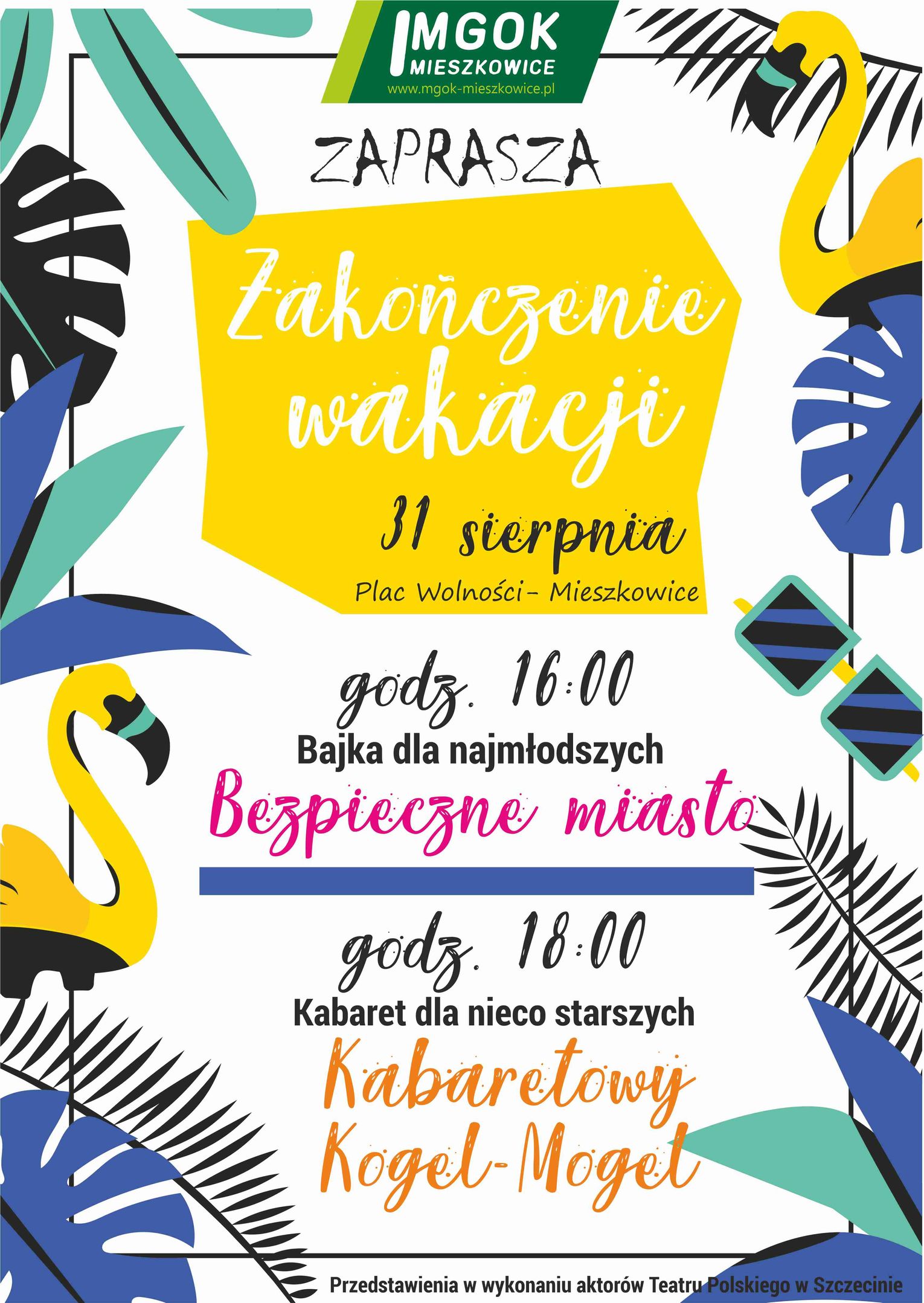 Miejsko Gminny Ośrodek Kultury w Mieszkowicach zaprasza na wydarzenie "Zakończenie wakacji", które odbędzie się 31 sierpnia o godz.16 na placu Wolności. Będzie kabaret dla dorosłych i sztuka dla dzieci.