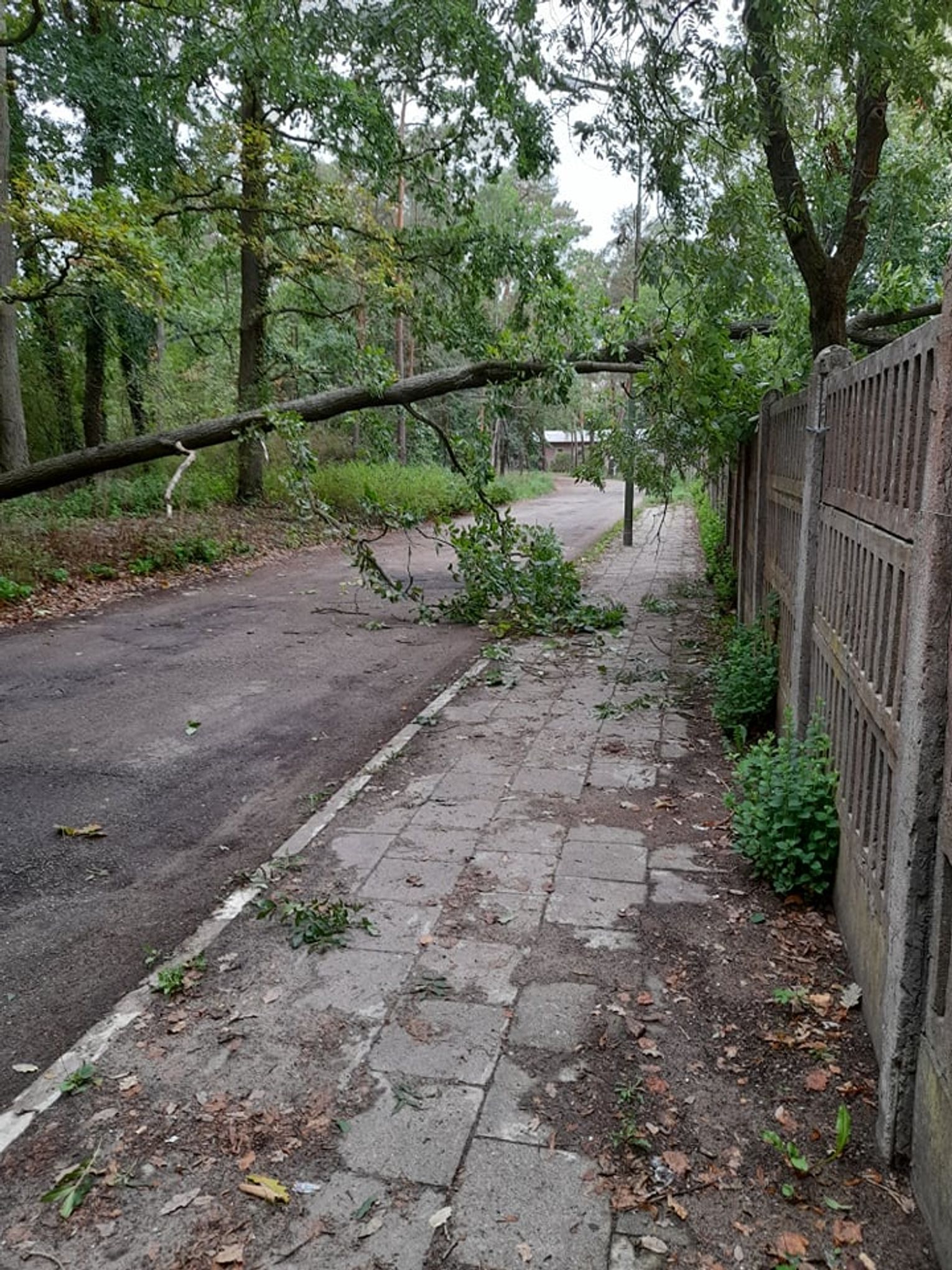 -Po przybyciu na miejsce zdarzenia i przeprowadzeniu rozpoznania stwierdzono drzewo leżące na pasie drogi oraz częściowo uszkodzony płot konstrukcji betonowej. Działania strażaków polegały na zabezpieczeniu miejsca zdarzenia oraz usunięciu drzewa z drogi przy pomocy pilarki do drewna. Pocięte drewno ułożono na poboczu drogi. Z jezdni usunięto pozostałości roślinne przy pomocy podręcznego sprzętu burzącego - informuje strażak z Komendy Powiatowej Państwowej Straży Pożarnej w Gryfinie.