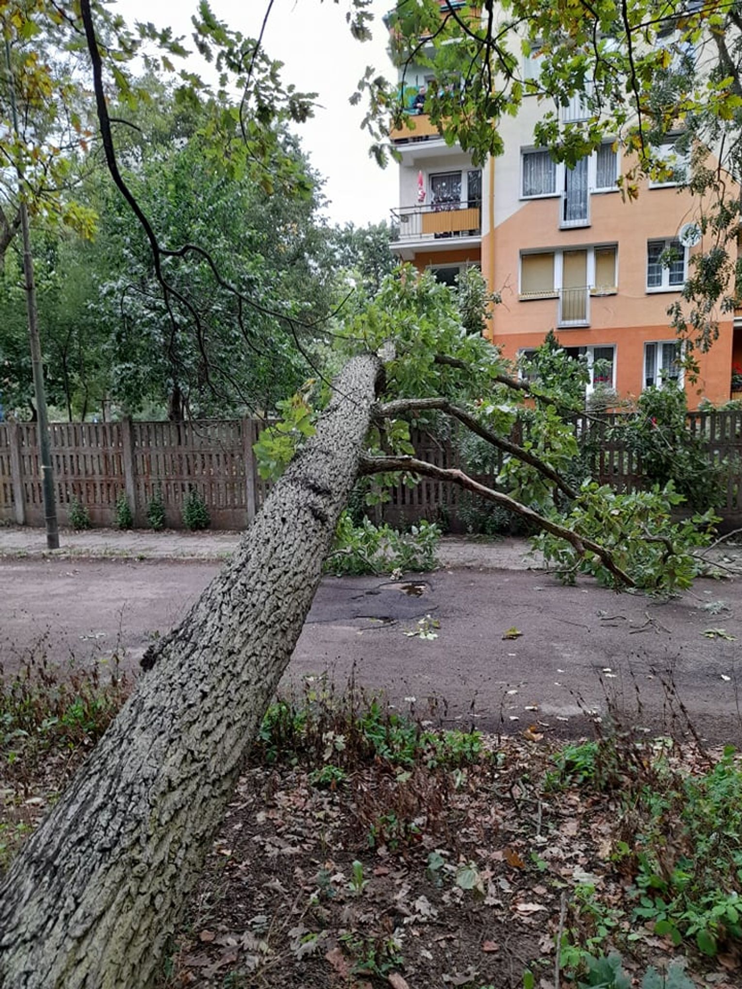 Dąb spadł na ogrodzenie pod oknem. Użyto sprzętu burzącego