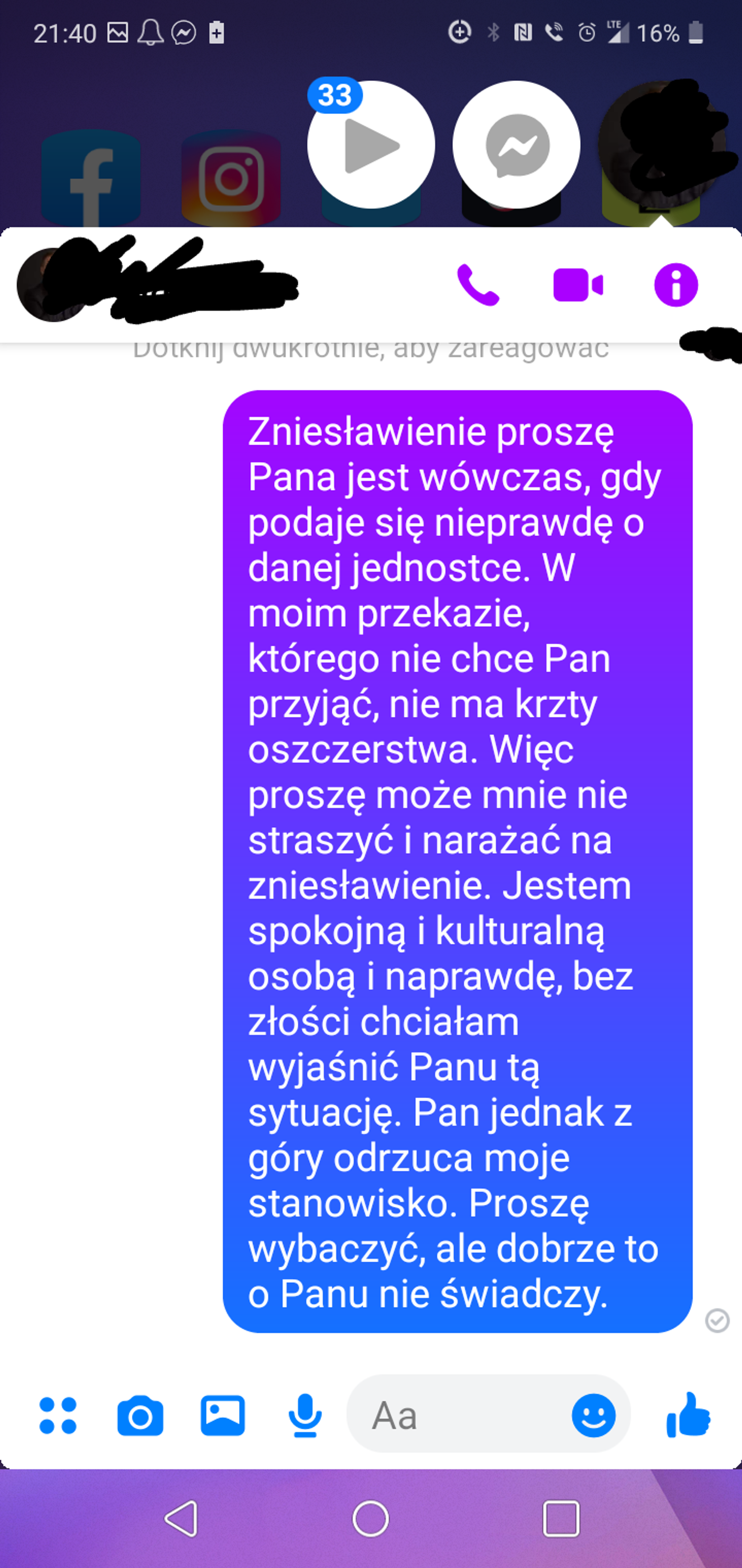 Odnalazłam go więc na fb, żeby opowiedzieć o nieprzyjemnościach, które mnie poprzedniego dnia spotkały i oto poniżej reakcja właściciela. Totalna zlewka, stronniczość i próba przestraszenia. Nie pozwolił mi nawet się wypowiedzieć. Nie podaję dokładnych namiarów na sklep ani personaliów właściciela. Jestem zaskoczona jego reakcją. Z drugiej jednak strony, skoro ekspedientka bezczelna, to nie ma się co dziwić, że właściciel ignorant.