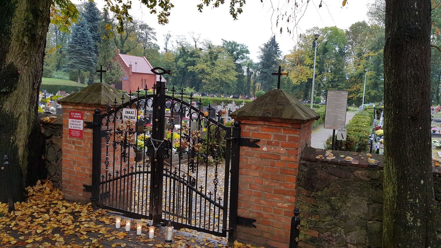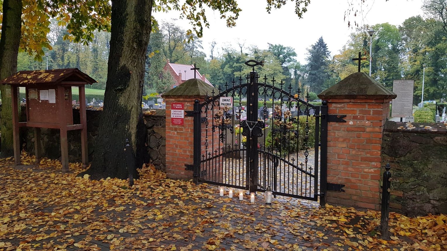 Na grobach wiele kwiatów. Zapalone znicze mieszkańcy Morynia zostawiają przed zamkniętą bramą cmentarza.