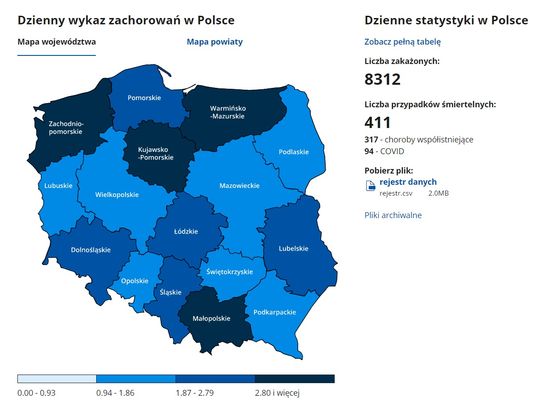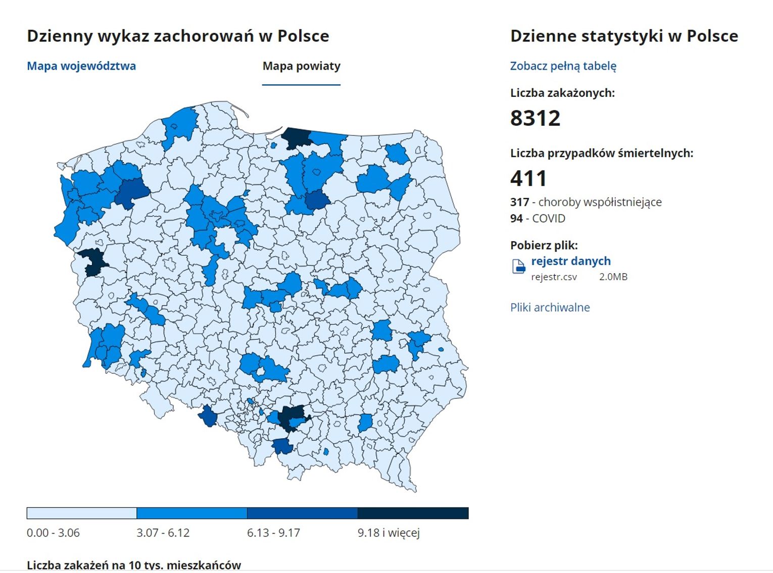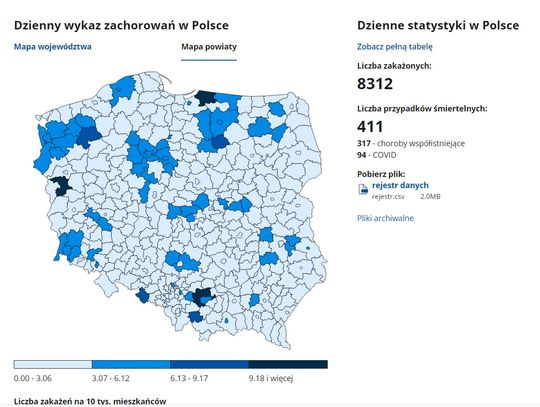 Dokładnie z powodu COVID-19 zmarły 94 osoby. Natomiast z powodu współistnienia COVID-19 z innymi schorzeniami zmarło 317 osób. To razem daje wspomniane 411 zgonów.
