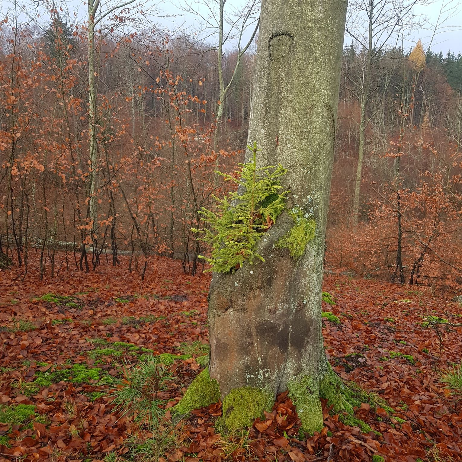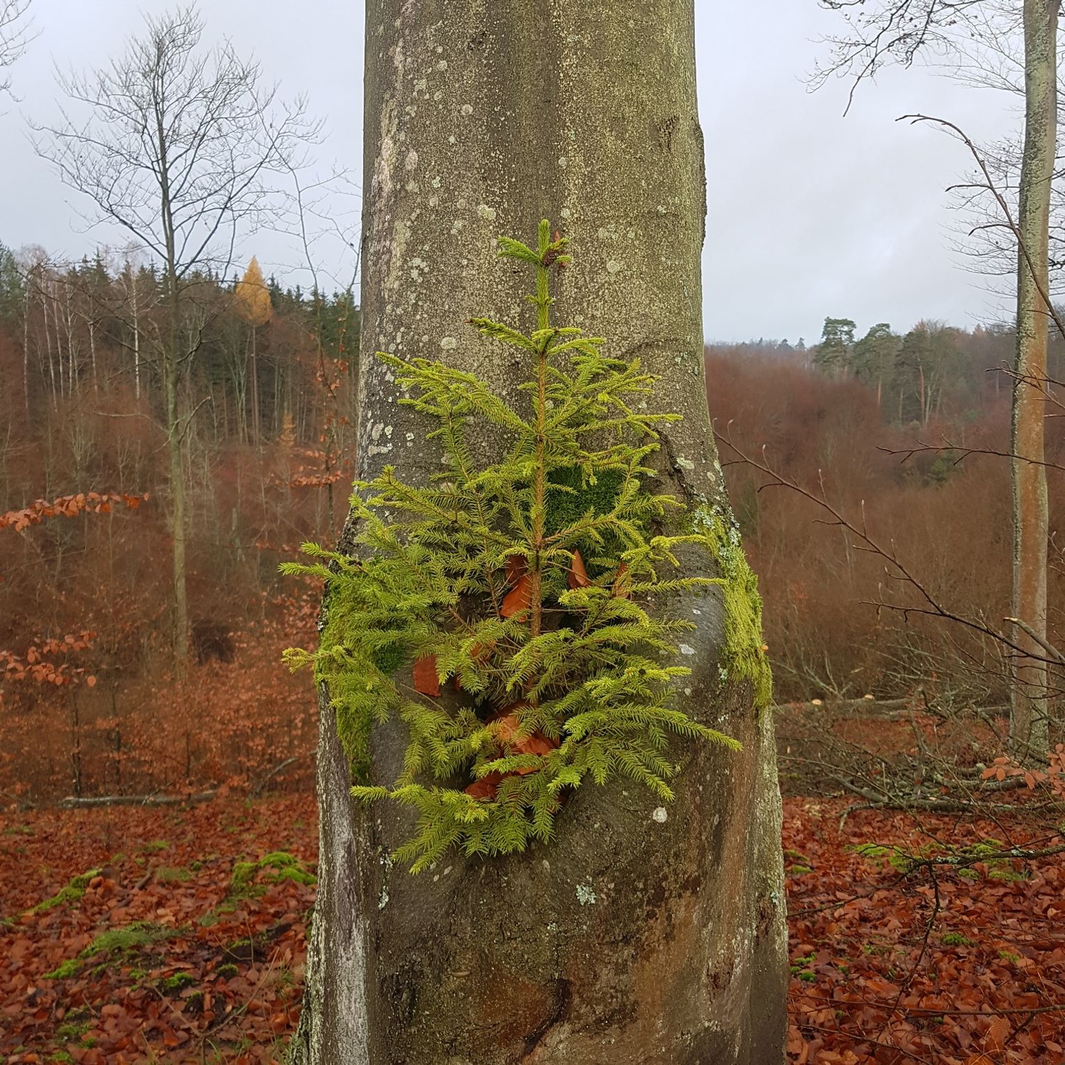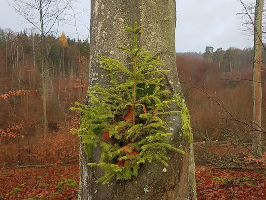 - W buku pospolitym, w miejscu po odłamanym pniu wyrósł świerk pospolity. Gnijące drewno, opadłe liście oraz gromadząca się woda stwarzają dogodne warunki do wzrostu i rozwoju współtowarzysza buka – mówi Katarzyna Rakoczy z Nadleśnictwa Smolarz.