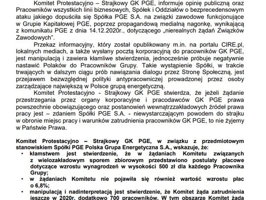 Komitet Protestacyjno – Strajkowy GK PGE, informuje opinię publiczną oraz Pracowników wszystkich linii biznesowych, Spółek i Oddziałów o bezprecedensowym ataku jakiego dopuściła się Spółka PGE S.A. na związki zawodowe funkcjonujące w Grupie Kapitałowej PGE, poprzez propagandową medialną nagonkę, wynikającą z komunikatu PGE z dnia 14.12.2020r., dotyczącego „nierealnych żądań Związków Zawodowych”.