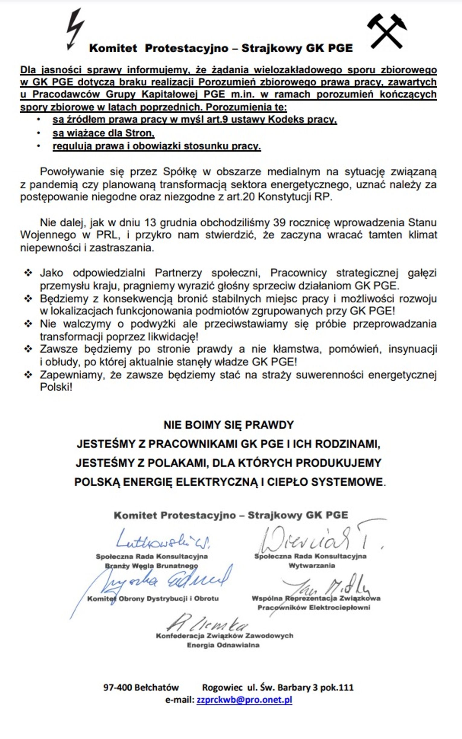 -Jako odpowiedzialni Partnerzy społeczni, Pracownicy strategicznej gałęzi przemysłu kraju, pragniemy wyrazić głośny sprzeciw działaniom GK PGE. Będziemy z konsekwencją bronić stabilnych miejsc pracy i możliwości rozwoju w lokalizacjach funkcjonowania podmiotów zgrupowanych przy GK PGE! Nie walczymy o podwyżki ale przeciwstawiamy się próbie przeprowadzania transformacji poprzez likwidację! Zawsze będziemy po stronie prawdy a nie kłamstwa, pomówień, insynuacji i obłudy, po której aktualnie stanęły władze GK PGE! -Zapewniamy, że zawsze będziemy stać na straży suwerenności energetycznej Polski!