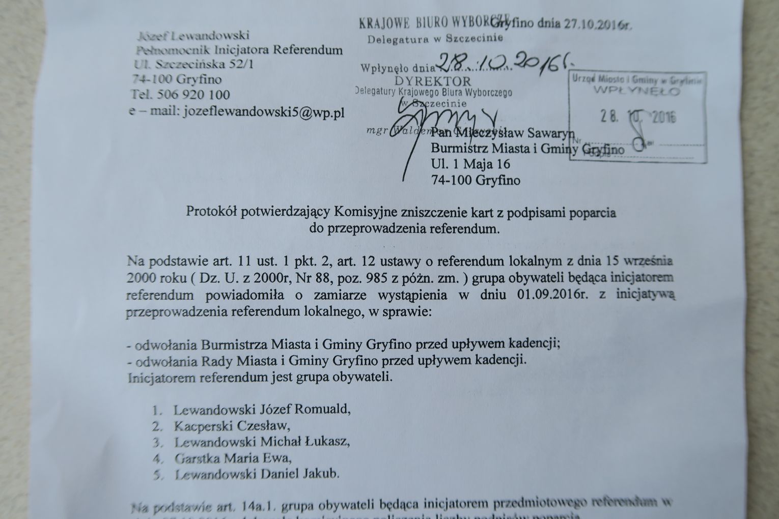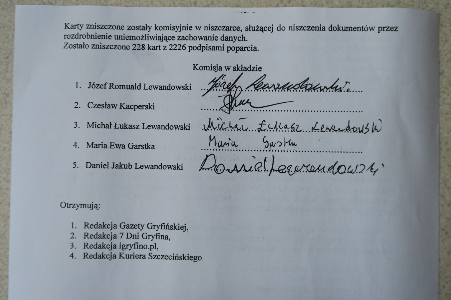 W fotogalerii przedstawiamy dostarczony nam protokół potwierdzający zniszczenie kart z podpisami poparcia do przeprowadzenia referendum w Gryfinie. Karty zniszczono w niszczarce do dokumentów.