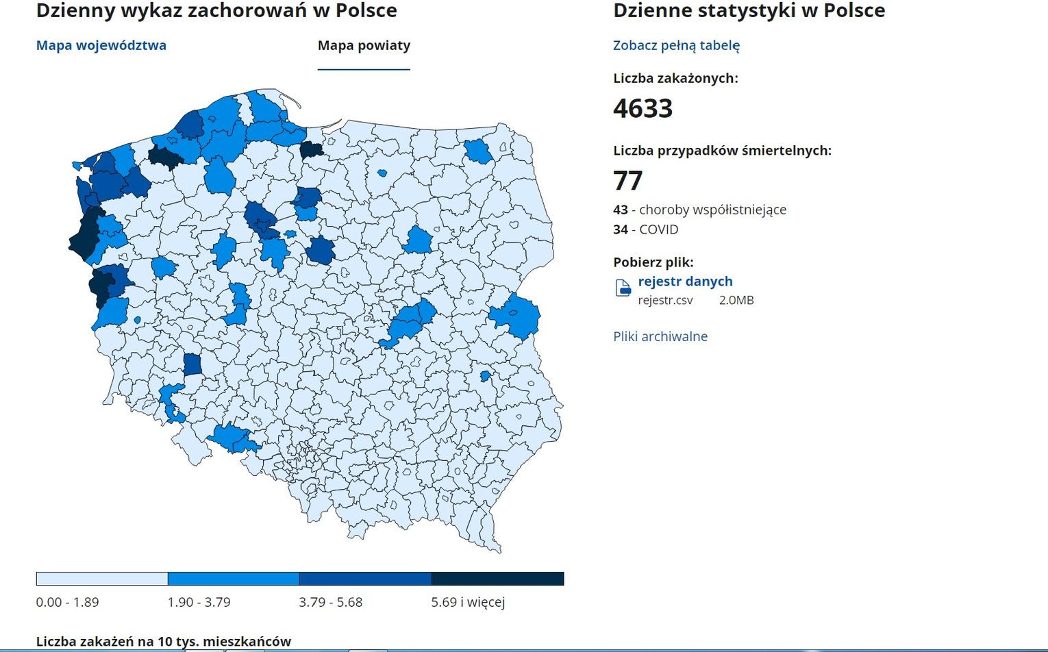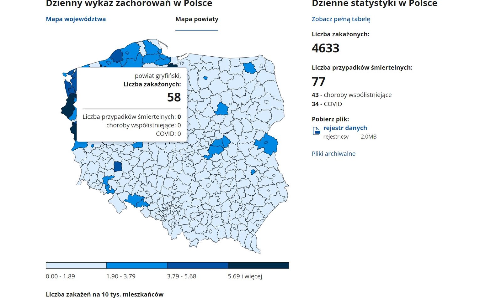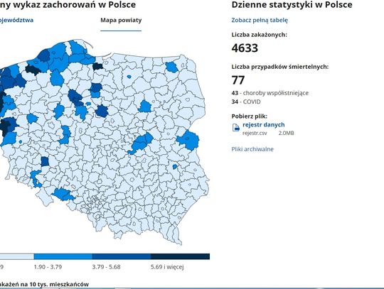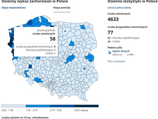 Znowu gorzej jest w powiecie gryfińskim - współczynnik zakażeń na 10 tys. mieszkańców wynosi obecnie aż 5,69 (podczas gdy np. w powiecie myśliborskim i pyrzyckim 1,9 - 3,79). Tak jak podawaliśmy we wstępie w powiecie gryfińskim odnotowano ostatniej doby 58 przypadków. Dla przypomnienia wczoraj było 45.