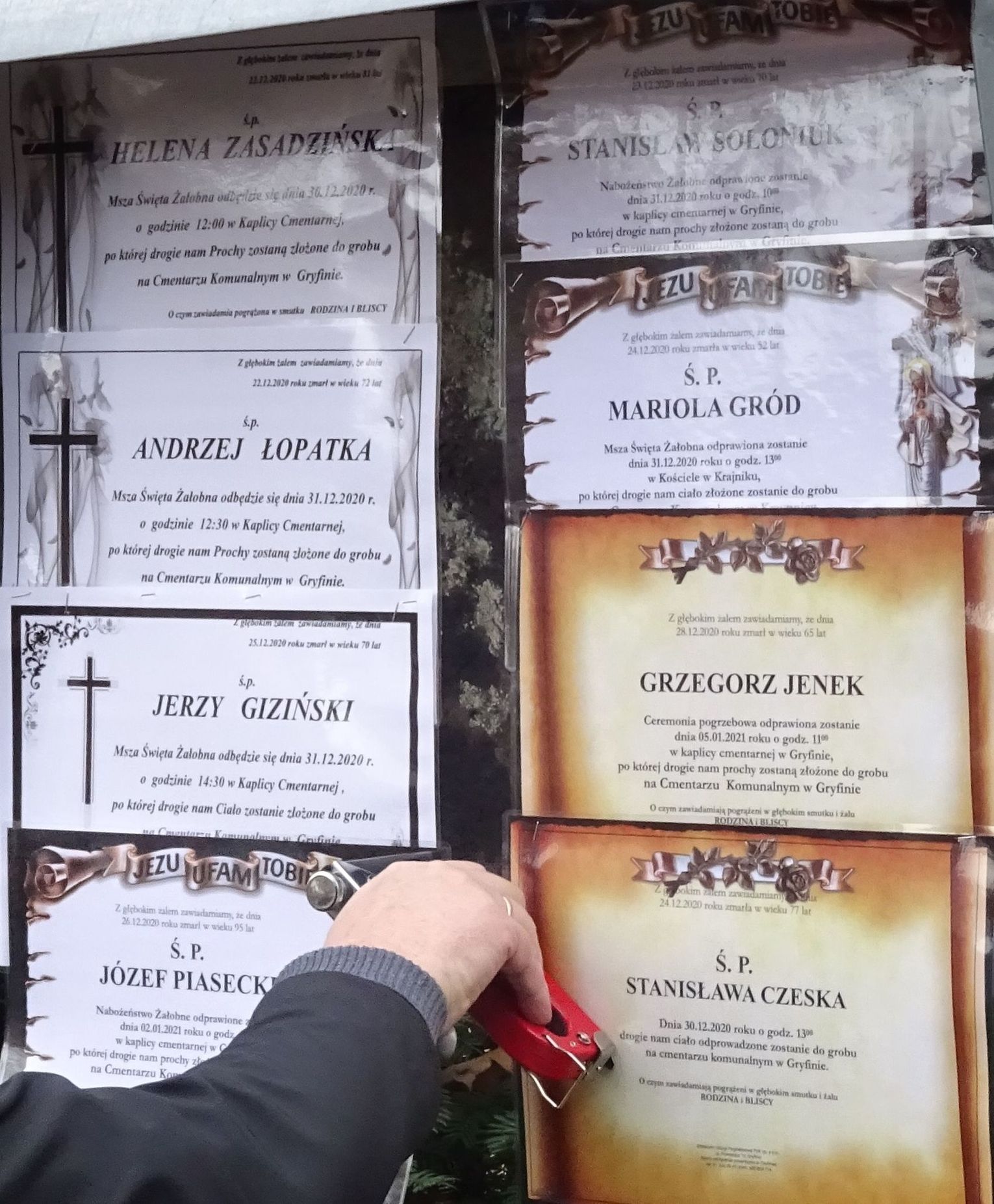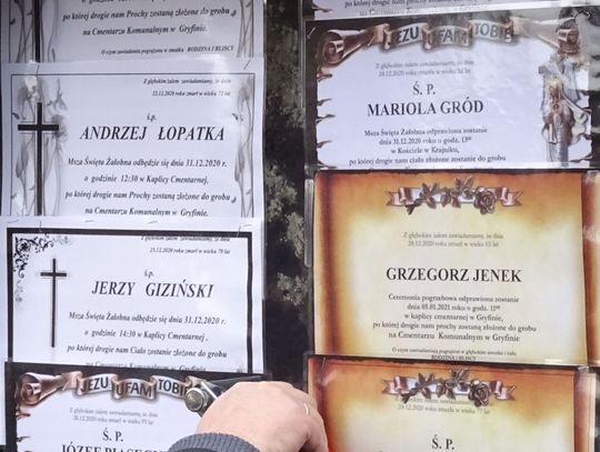 Tablica ogłoszeniowa na Cmentarzu Komunalnym w Gryfinie jest większa niż te w mieście. Ale i tutaj klepsydry nie mieszczą się ostatnimi czasy i umieszcza się je jedna na drugiej, a nawet dokleja na dole. Ilość zgonów stanowi też swoisty papierek lakmusowy sytuacji epidemiologicznej w Gryfinie.