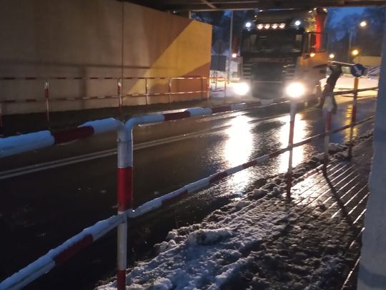 Ciężarowy samochód nie zmieścił się pod wiaduktem w Gryfinie. Utknął podczas próby przejazdu, pomimo znaku informującego o maksymalnej wysokości aut pokonujących tę trasę.