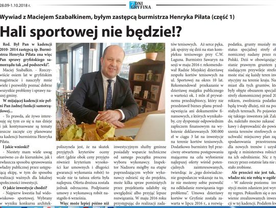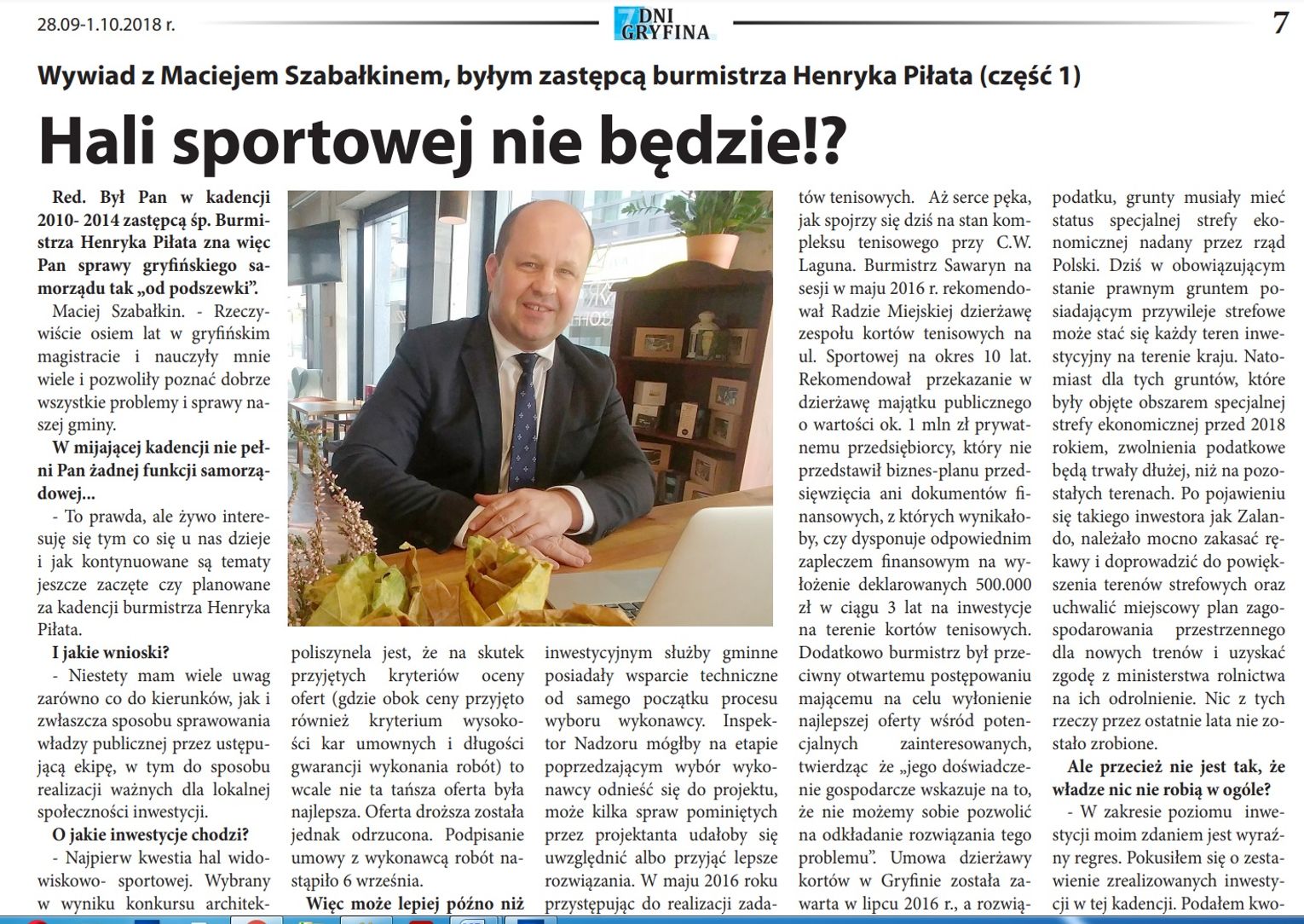 Poniżej fragment wywiadu w 7 Dniach Gryfina z 1 października 2018 r., gdzie redaktor Ryszard Kwapisz przepytuje byłego wiceburmistrza (zastępcę Henryka Piłata) – Macieja Szabałkina.