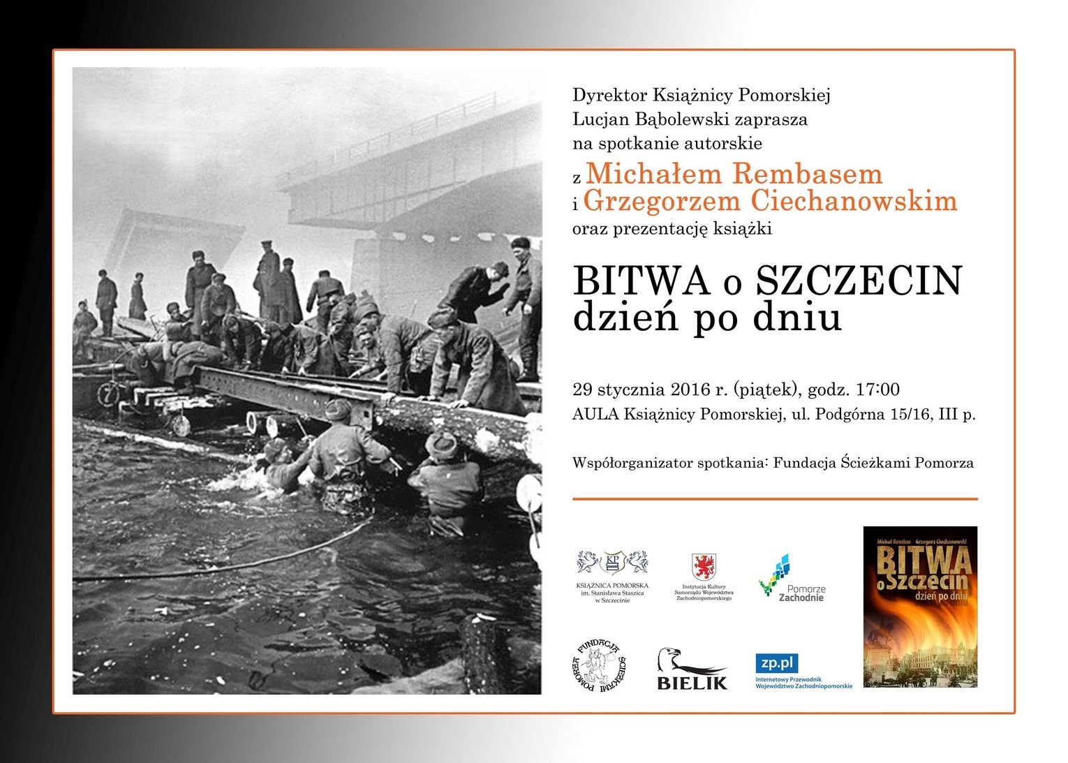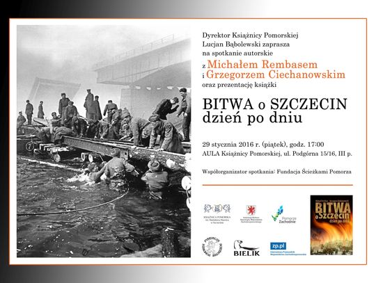 Na spotkanie autorskie z Michałem Rembasem i Grzegorzem Ciechanowskim, promujące książkę "Bitwa o Szczecin dzień po dniu" zapraszają dyrektor Książnicy Pomorskiej Lucjan Bąbolewski oraz Fundacja Ścieżkami Pomorza. Książka w sposób chronologiczny przedstawia walki o Szczecin w 1945 roku. Można w niej znaleźć szczegółowy opis wydarzeń, dziesiątki relacji świadków walk, wiele zdjęć, planów a także opisów pomników i cmentarzy.