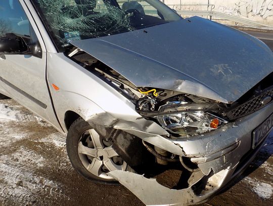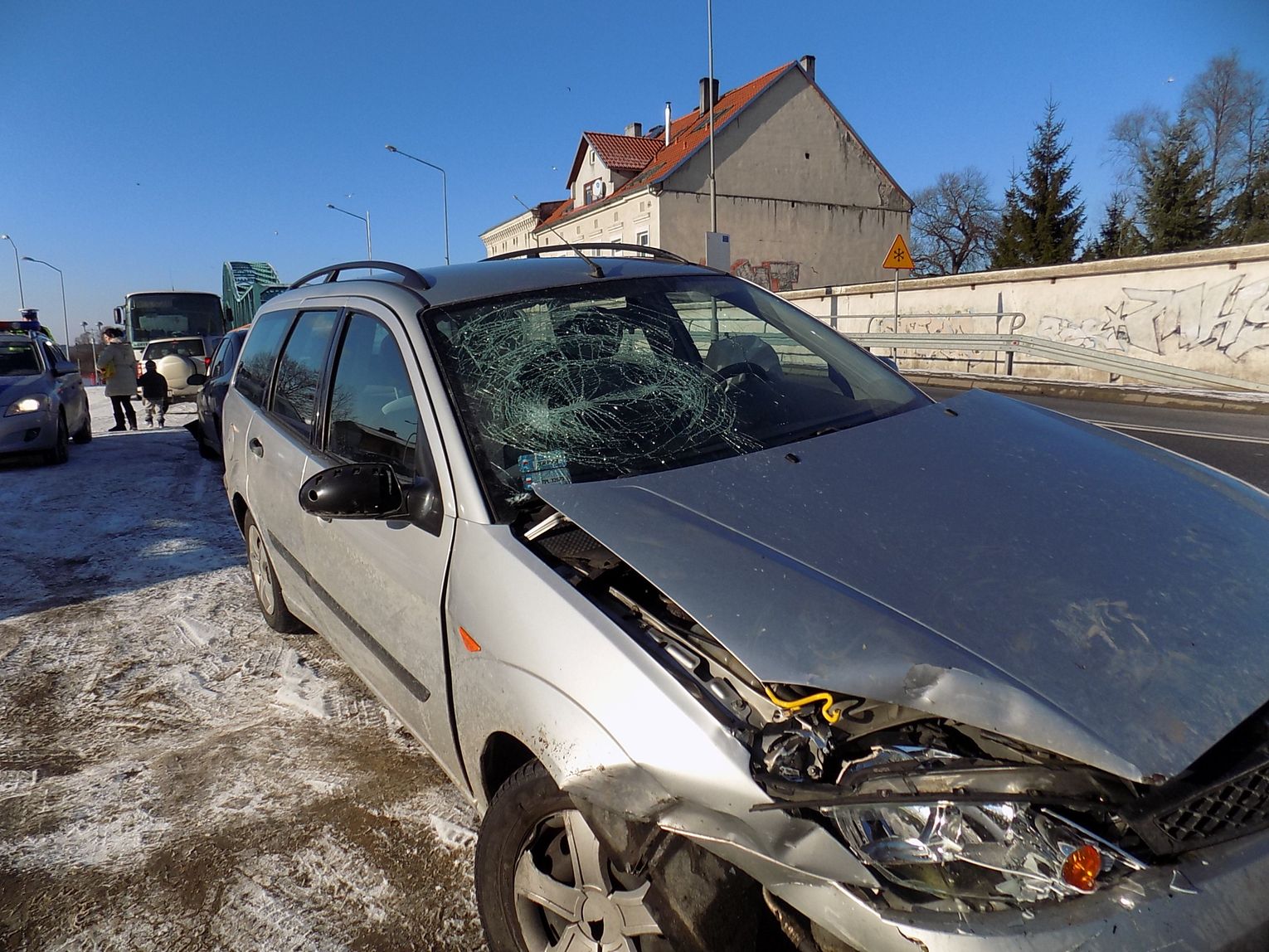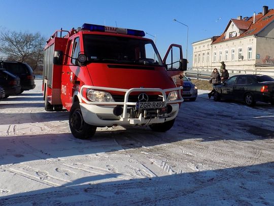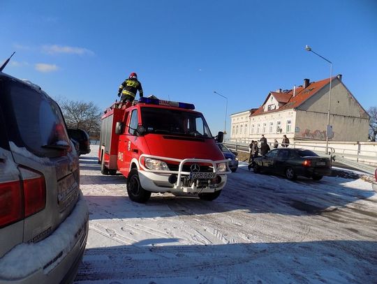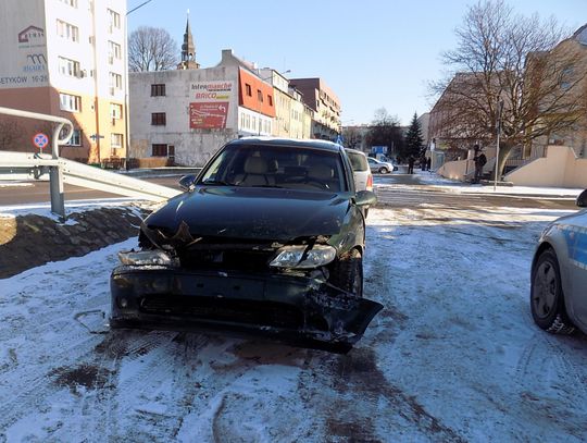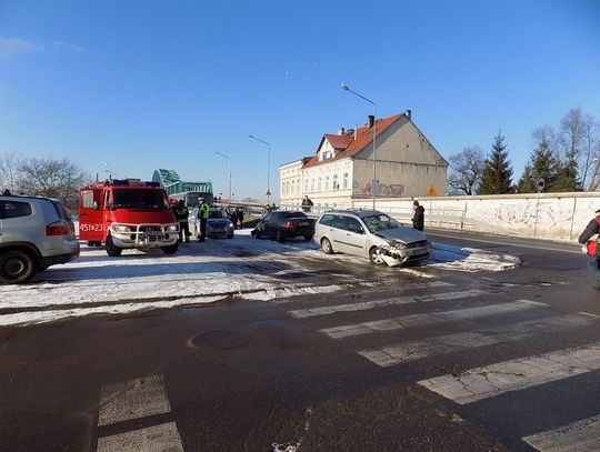 Siwy ford zjeżdżał z mostu. Ciemny opel jechał z parkingu na nabrzeżu. I miejsca okazało się za mało... Kierowcę z rozbitą głową opatrzyli ratownicy z karetki. Przyczyny wypadku ustala policja.
