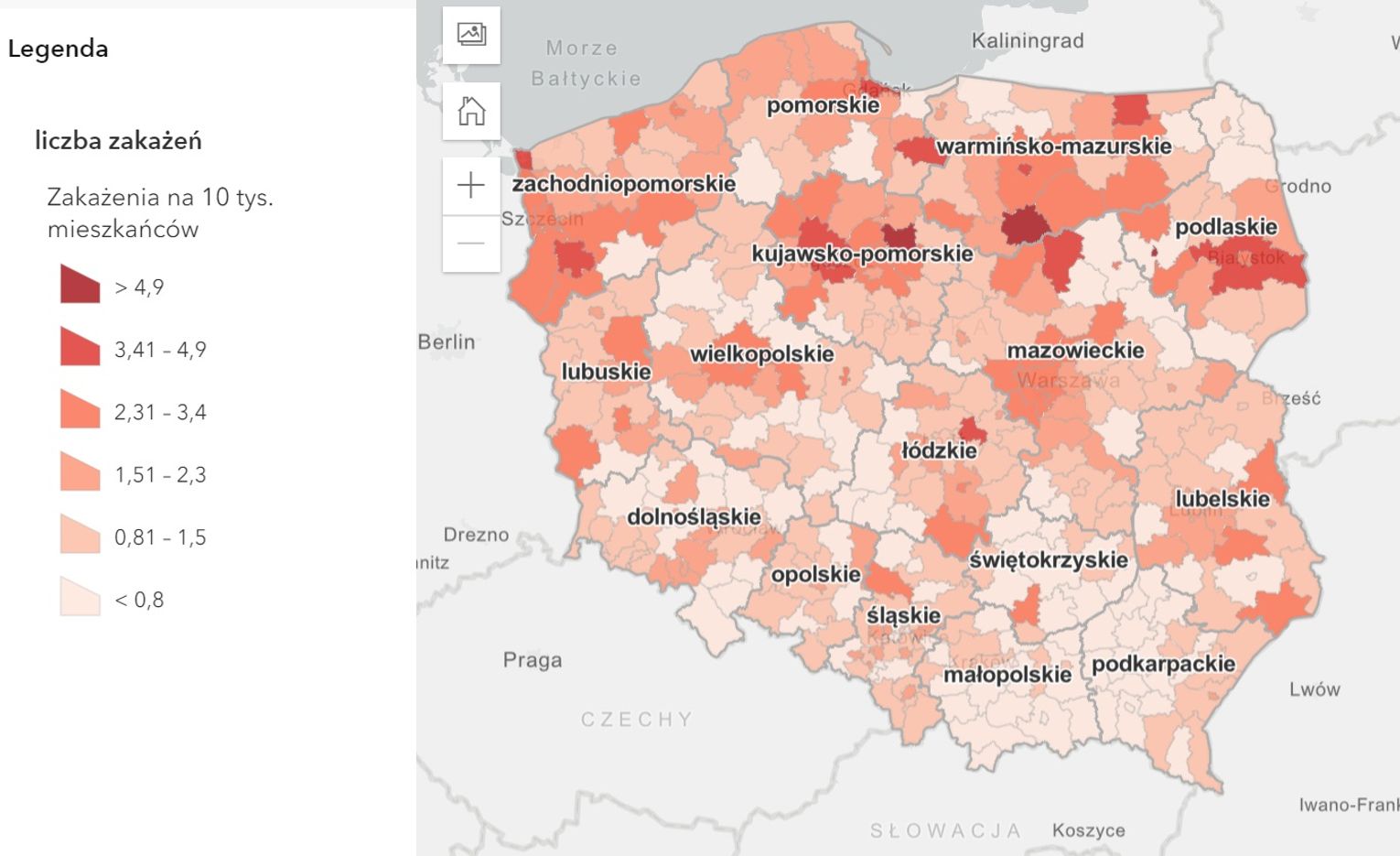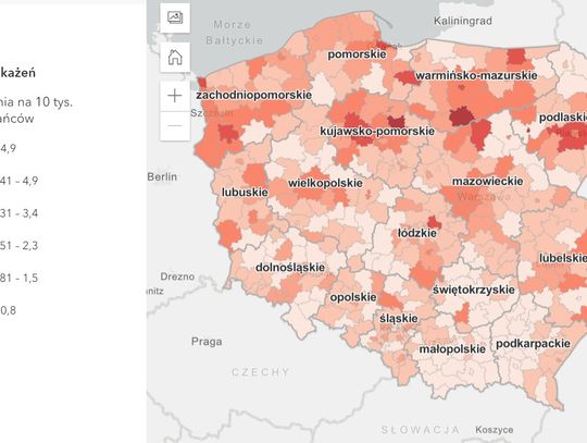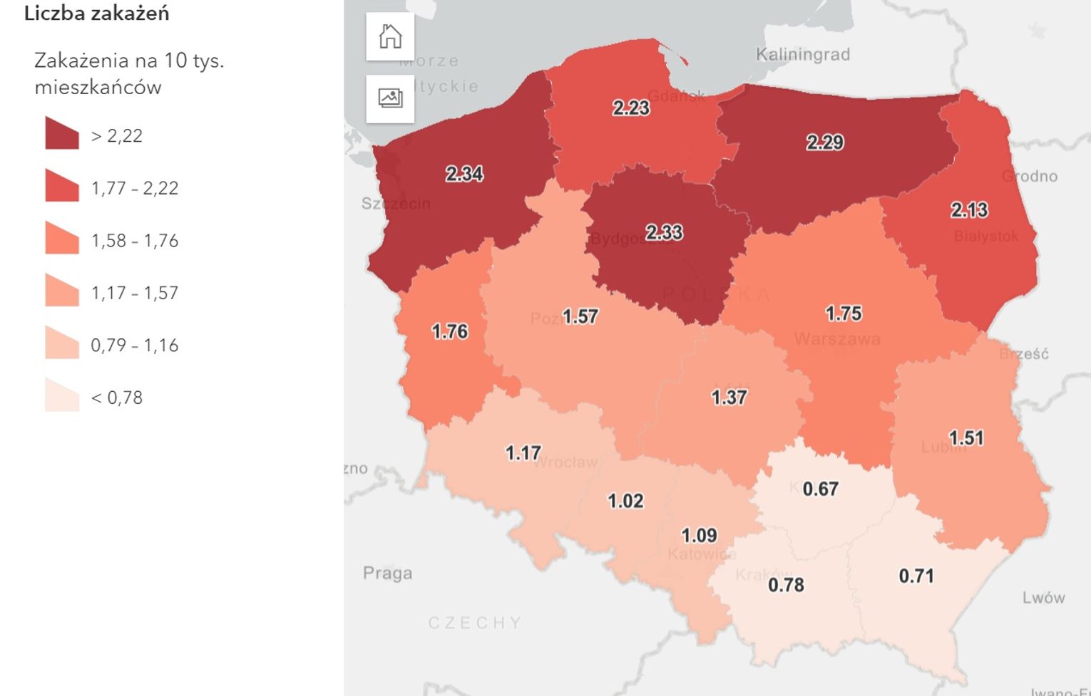 Dzisiaj w naszym województwie odnotowano dość najwyższą na tle w kraju liczbę zakażeń na 10 tys. mieszkańców. Współczynnik ten wynosi 2,34. W związku z tym nasze województwo na mapie zakażeń jest zaznaczone najciemniejszym kolorem.