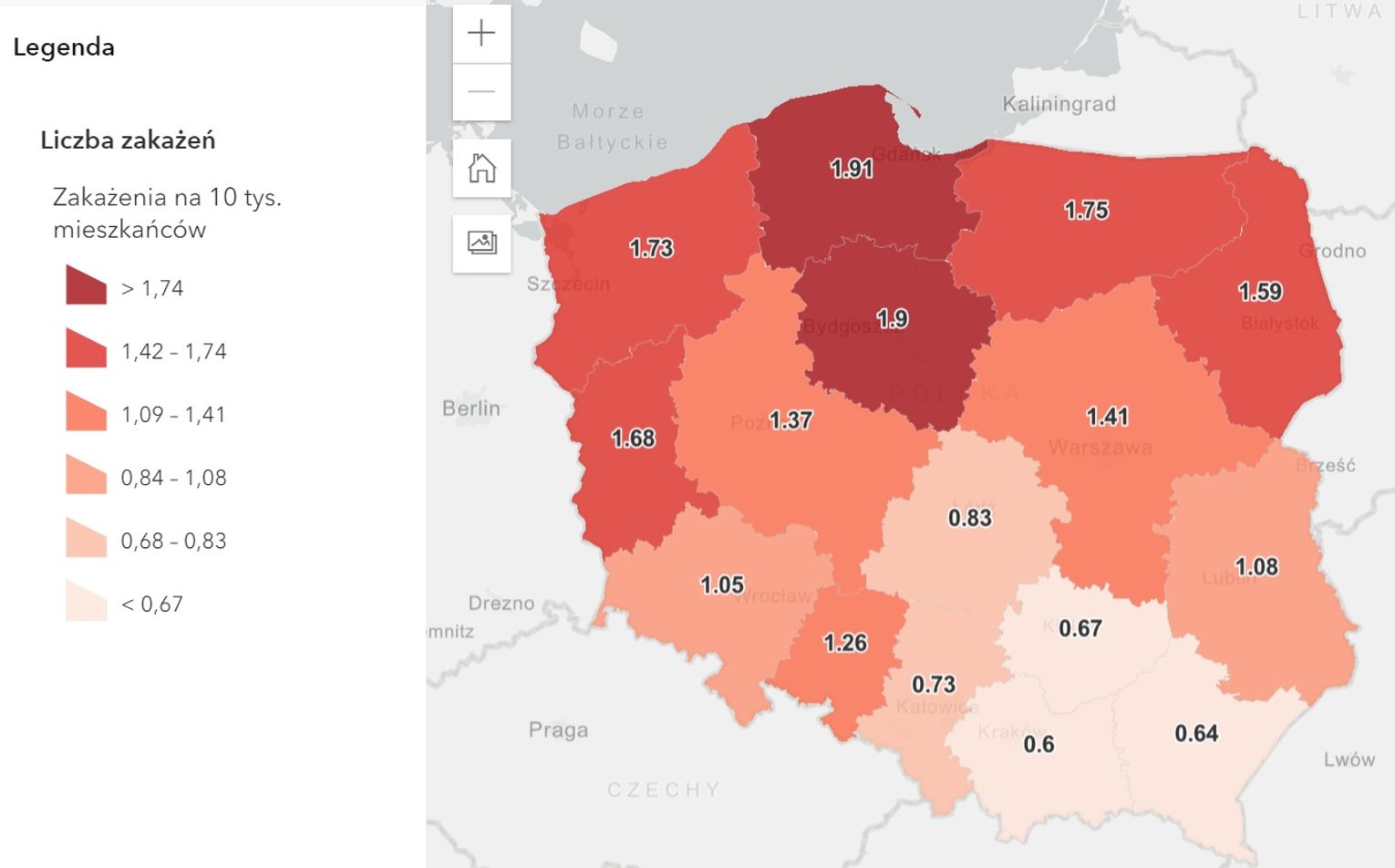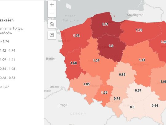 Dzisiaj w naszym województwie odnotowano średnią na tle w kraju liczbę zakażeń na 10 tys. mieszkańców. Współczynnik ten wynosi 1,73. W związku z tym nasze województwo na mapie zakażeń jest zaznaczone jaśniejszym kolorem.