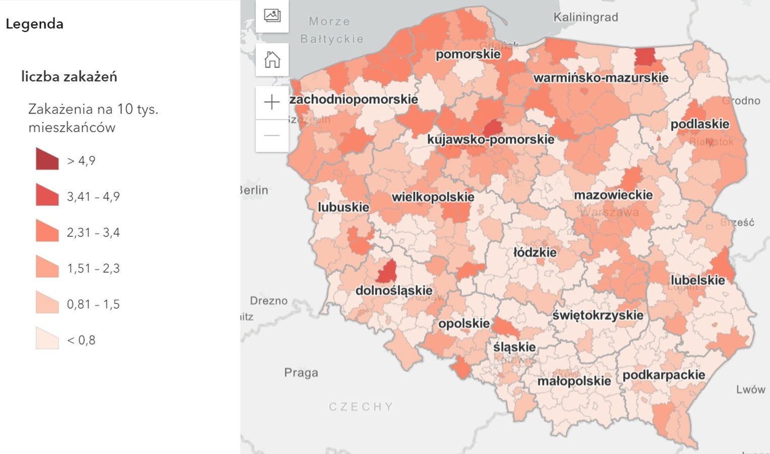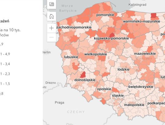 Nieco niższy niż ostatnio jest w powiecie gryfińskim współczynnik zakażeń na 10 tys. mieszkańców. Dzisiaj wynosi 2,21. W związku z tym na mapie zakażeń w Polsce nasz powiat zaznaczony jest nieco jaśniejszym kolorem.