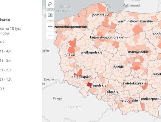 Niższy niż ostatnio jest w powiecie gryfińskim współczynnik zakażeń na 10 tys. mieszkańców. Dzisiaj wynosi 1,35. W związku z tym na mapie zakażeń w Polsce nasz powiat zaznaczony jest jaśniejszym kolorem.