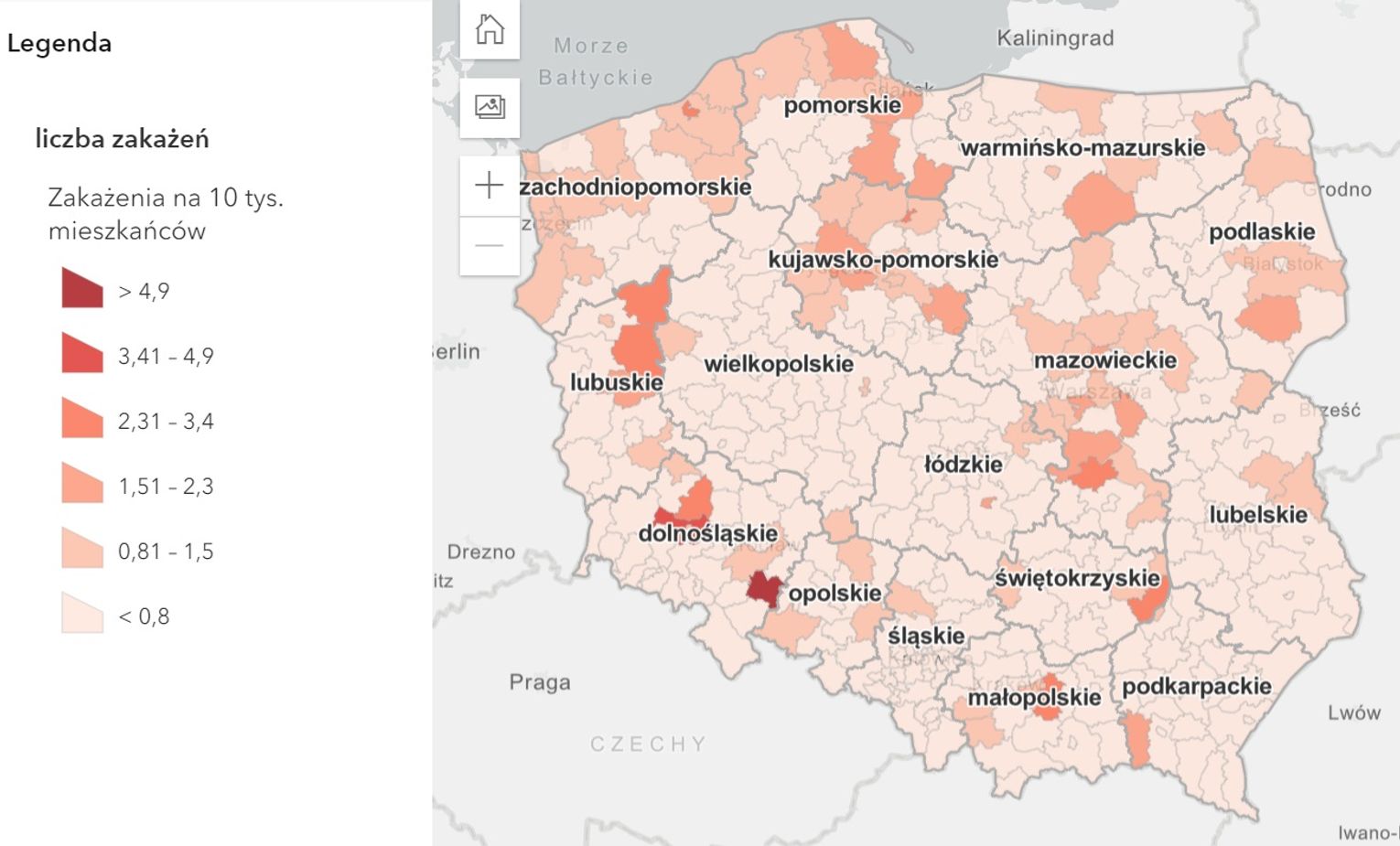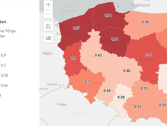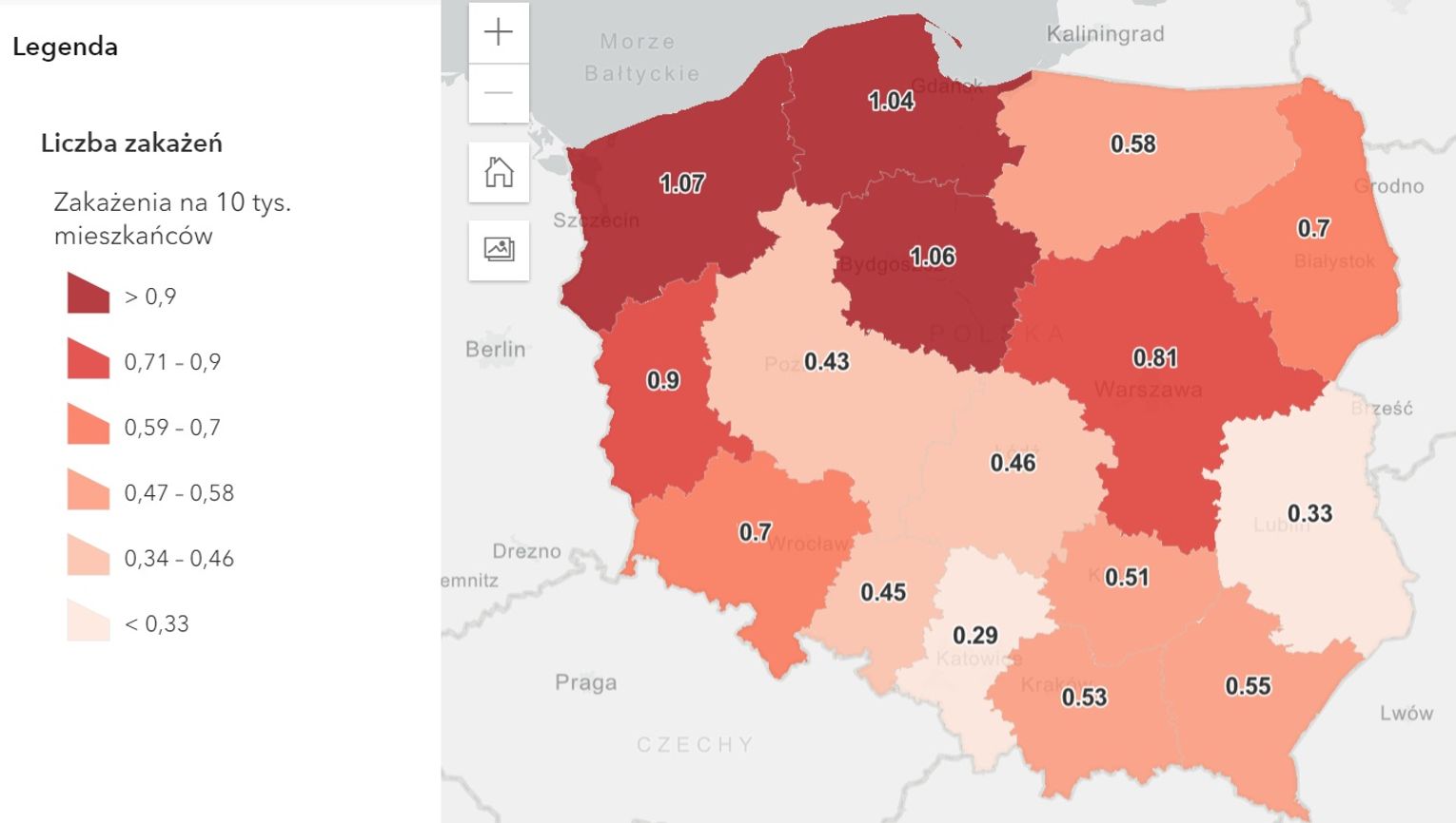 Dzisiaj w naszym województwie odnotowano dość wysoką na tle w kraju liczbę zakażeń na 10 tys. mieszkańców. Współczynnik ten wynosi 1,07. W związku z tym nasze województwo na mapie zakażeń jest zaznaczone najciemniejszym kolorem.