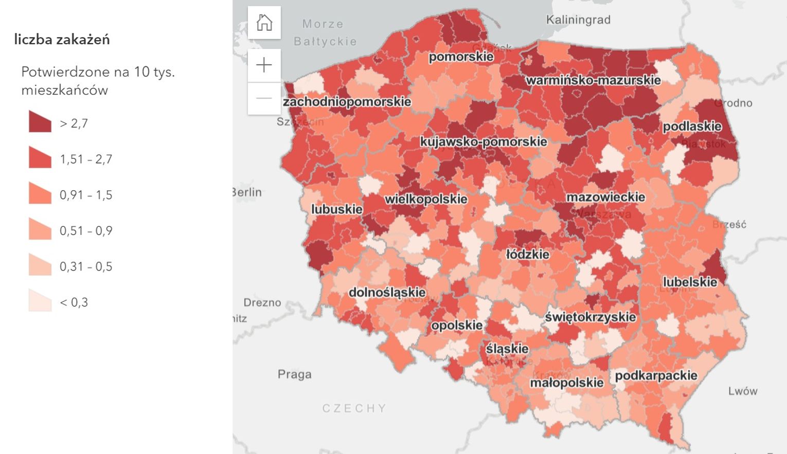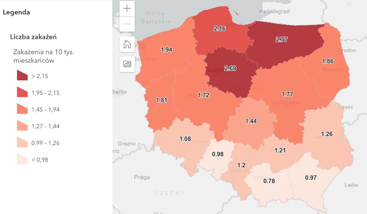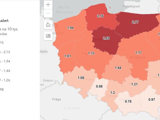 Dzisiaj w naszym województwie odnotowano średnią na tle w kraju liczbę zakażeń na 10 tys. mieszkańców. Współczynnik ten wynosi 1,94. W związku z tym nasze województwo na mapie zakażeń jest zaznaczone jaśniejszym kolorem.