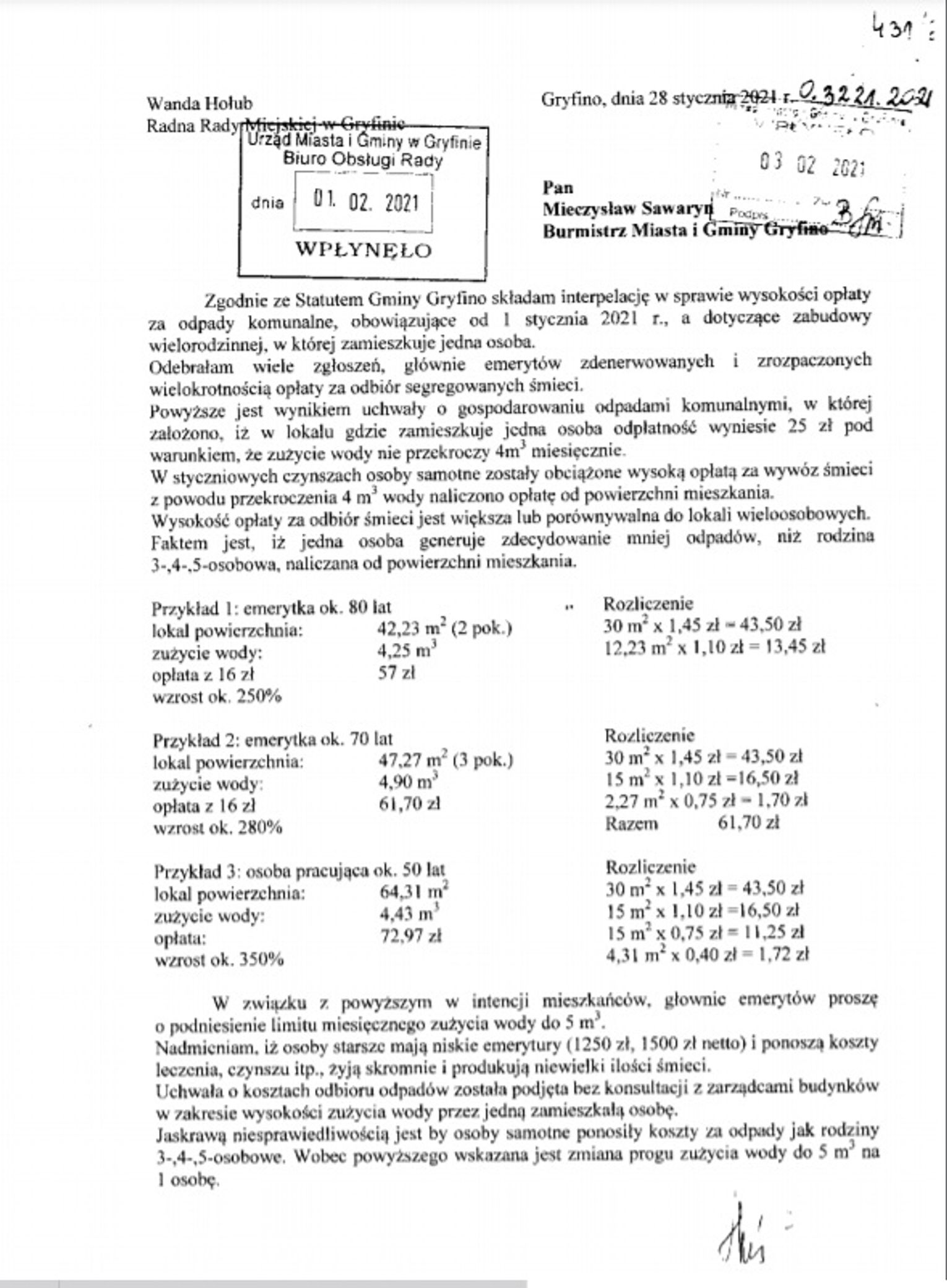 Stąd apel radnej Wandy Hołub z 28 stycznia 2021 r. o podniesienie limitu zużycia wody w lokalu zamieszkiwanym przez jedną osobę do 5m3 miesięcznie.