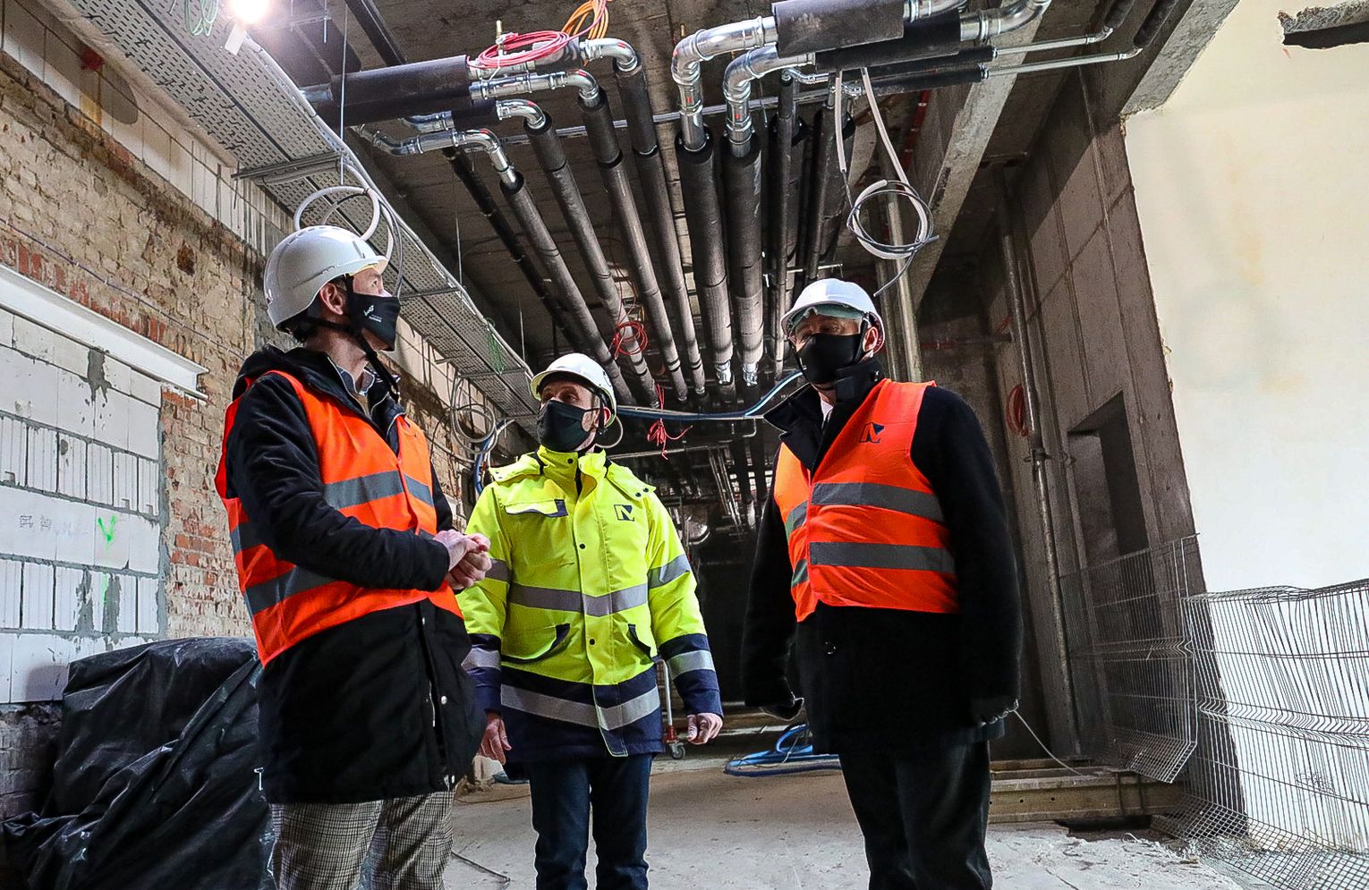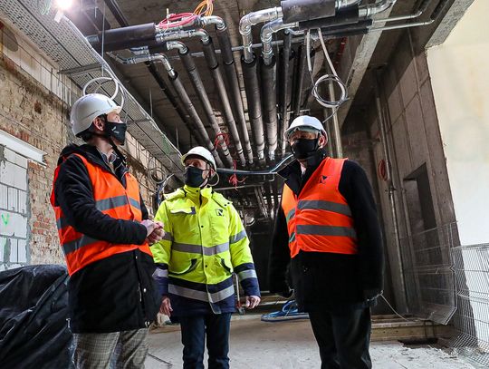 W niektórych miejscach masywnych ceglanych murów sprzed prawie stu lat są wypełnienia z cegieł lub pustaków, w innych punktach widać podkucia, wzmocnienia, nadproża. Nowe otwory drzwiowe i konstrukcje ścian działowych. Tysiące metrów aluminiowych profili, szyn, przewodów, kanałów. Wkrótce zasłonią to podwieszane sufity.