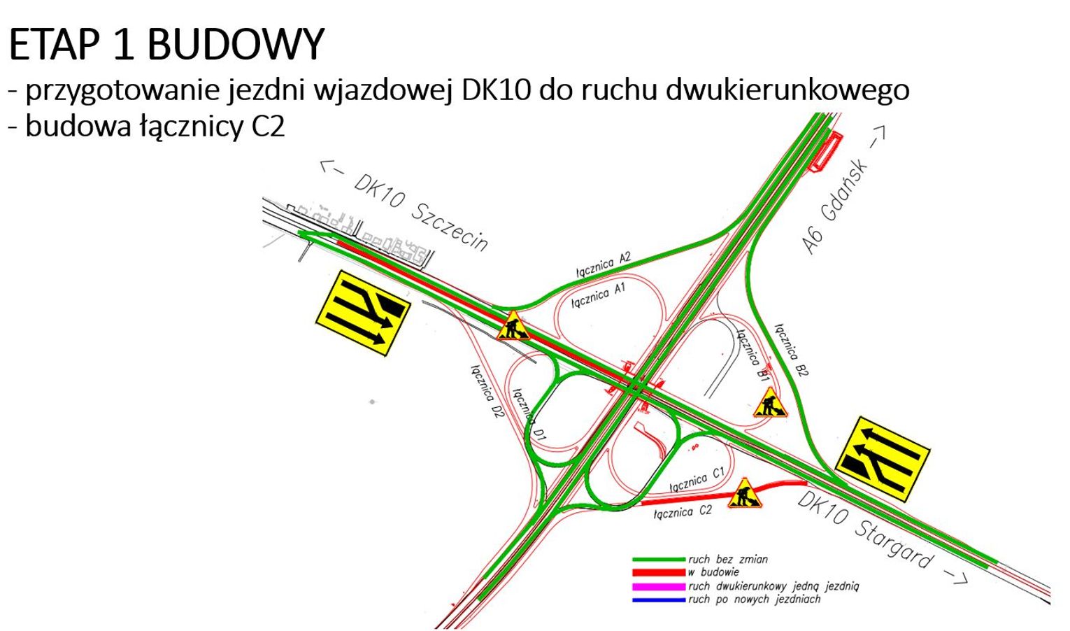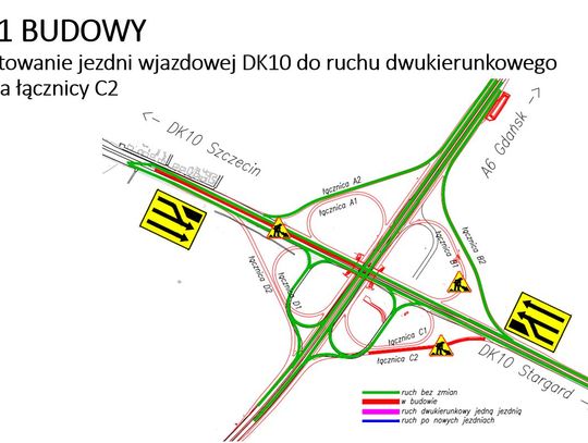Pod koniec lutego podpisaliśmy umowę na dokończenie rozbudowy węzła drogowego Szczecin Kijewo. Firma Budimex przystąpiła do prac, w pierwszym etapie będą prowadzone roboty związane z przygotowaniem niezbędnych poszerzeń i połączeń między jezdniami, tak aby były możliwe kolejne zmiany organizacji ruchu. Budowana jest również nowa łącznica relacji Kołbaskowo – Stargard, która powstanie w pierwszej kolejności, tak aby wprowadzać jak najmniejsze utrudnienia dla relacji Kołbaskowo – Stargard i Szczecin – Świnoujście. Do końca marca będą jeszcze trwały prace przy ekranach akustycznych przed skrzyżowaniem z ulicą Kurzą i Niedźwiedzią, w tym miejscu na jezdni w stronę Szczecina będzie okresowo zamykany prawy pas ruchu. W kwietniu planowane jest przeniesienie ruchu w obu kierunkach na jezdnię DK10 w stronę Szczecina. W kolejnych tygodniach zmiany w organizacji ruchu będą obejmowały również kierowców jadących autostradą A6.