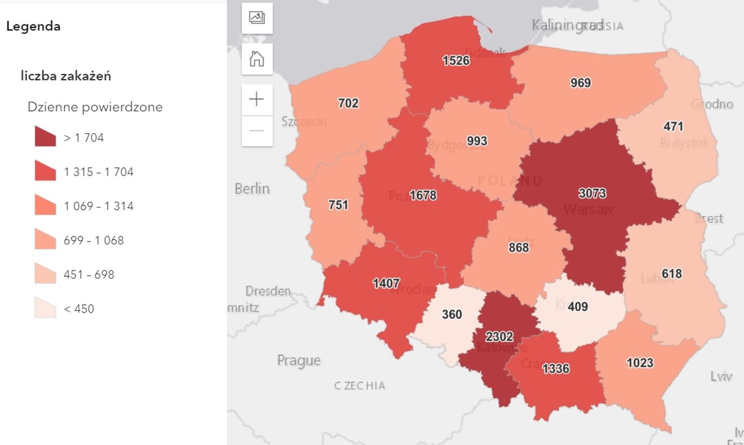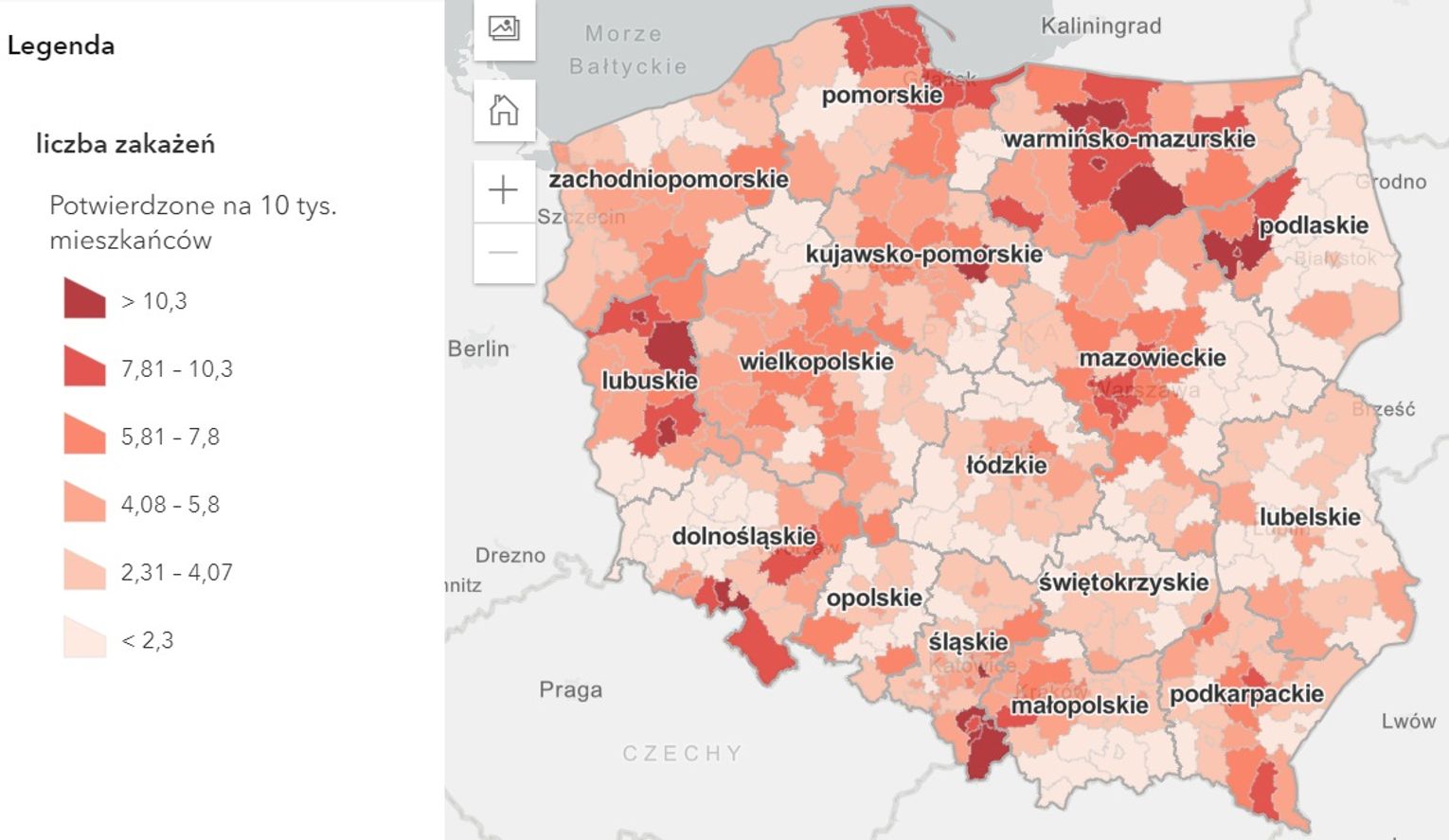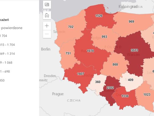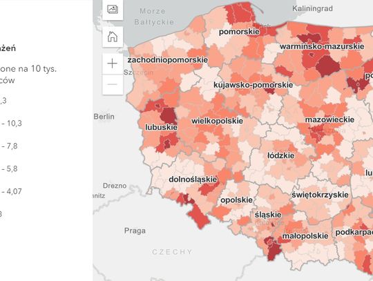 Dzisiaj w naszym województwie odnotowano stosunkowo niską na tle w kraju liczbę zakażeń na 10 tys. mieszkańców. W związku z tym nasze województwo na mapie zakażeń jest zaznaczone nieco jaśniejszym kolorem.