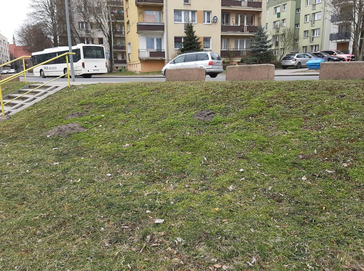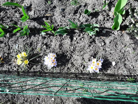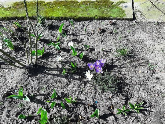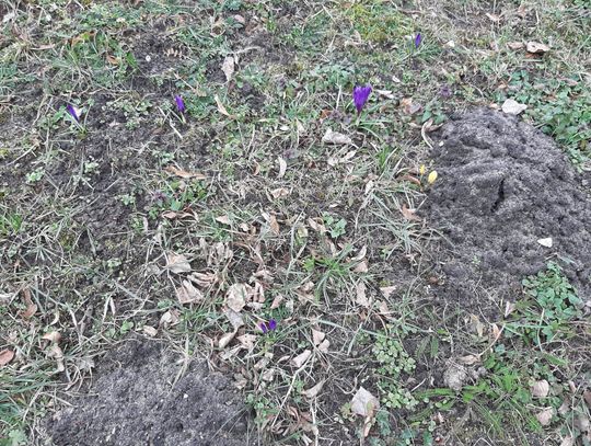 Krokusy posadzone zostały dwa lata temu. Jak mówią mieszkańcy, stało się to za wiedzą i aprobatą prezesa Spółdzielni Dolna Odra. I cieszą oko. Jak najlepiej wyglądają w słońcu. Niestety dziś pojawił się pan kret...