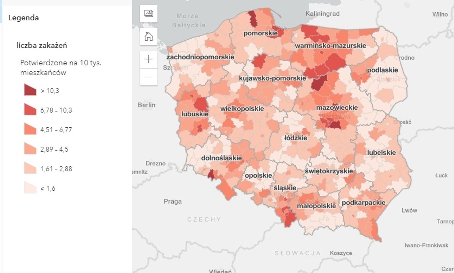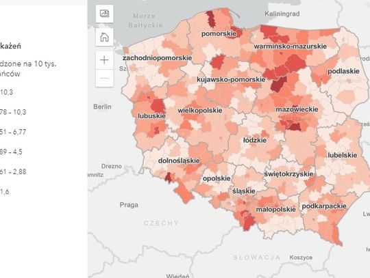 Dzisiaj w naszym województwie odnotowano średnią na tle w kraju liczbę zakażeń na 10 tys. mieszkańców. Współczynnik ten wynosi 6,34. W związku z tym nasze województwo na mapie zakażeń jest zaznaczone nieco jaśniejszym kolorem.