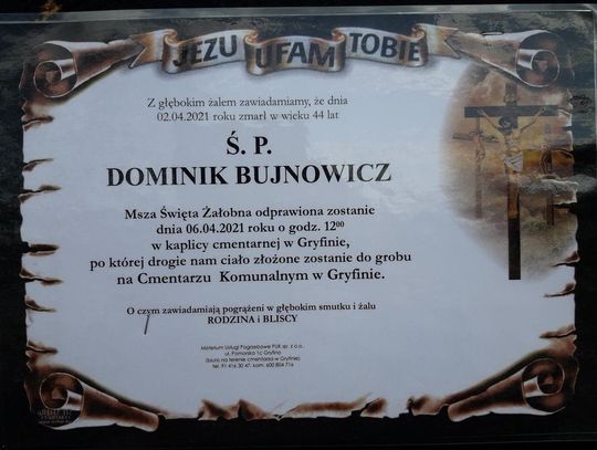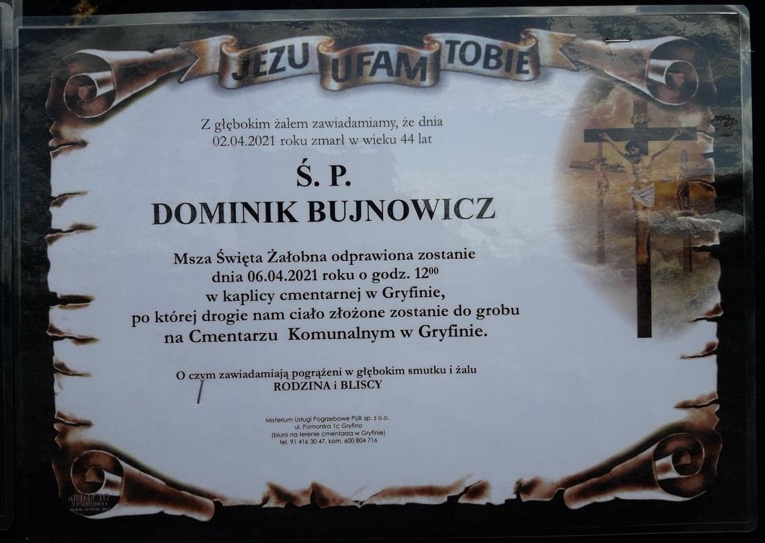 6 kwietnia 2021 r. we wtorek pożegnamy w Gryfinie 44-letniego Dominika Bujnowicza.