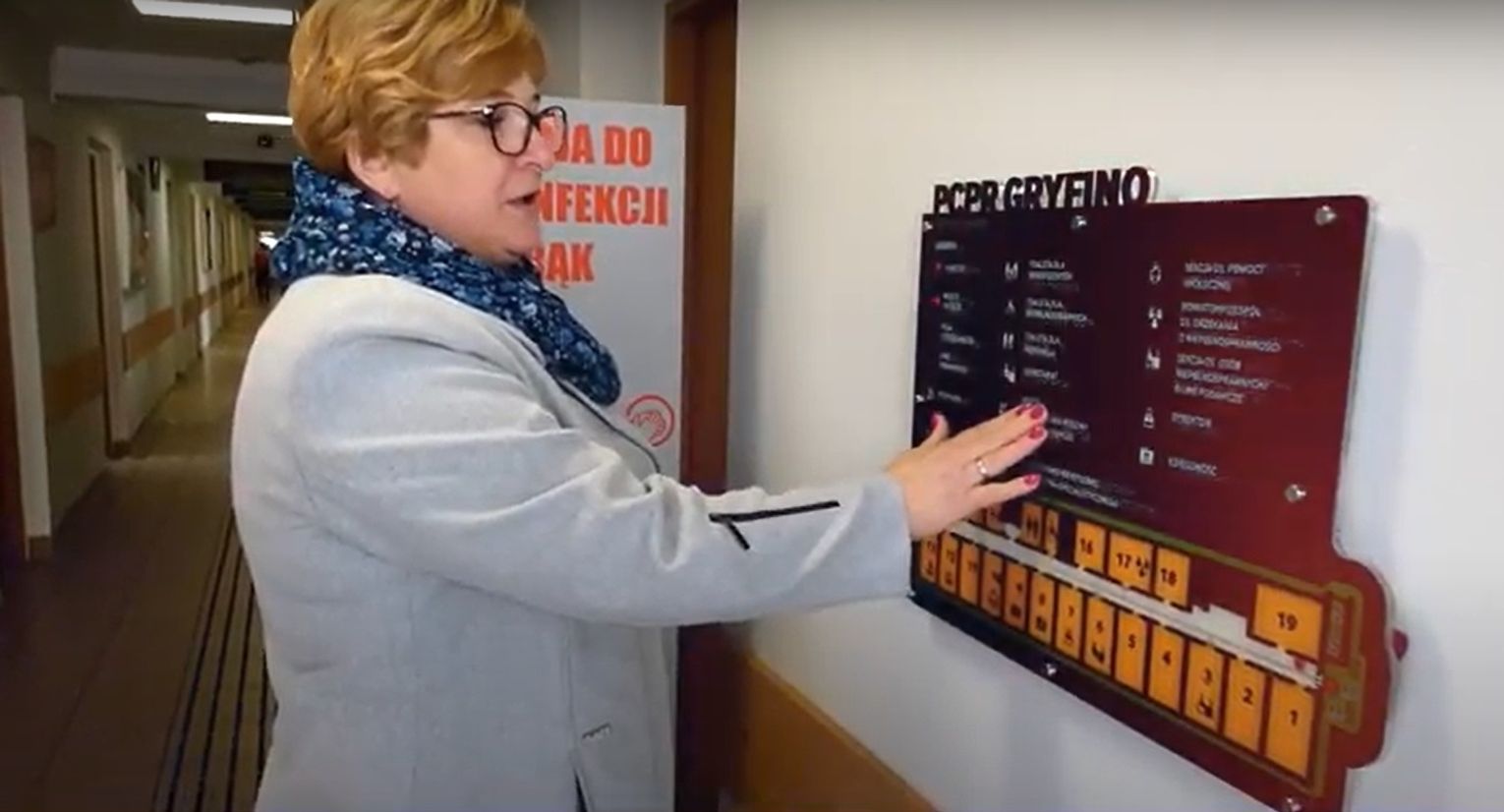 Zakres wykonanych prac w budynku PCPR w Gryfinie wprowadza wiele udogodnień dla osób niewidomych i niepełnosprawnych ruchowo, m.in: