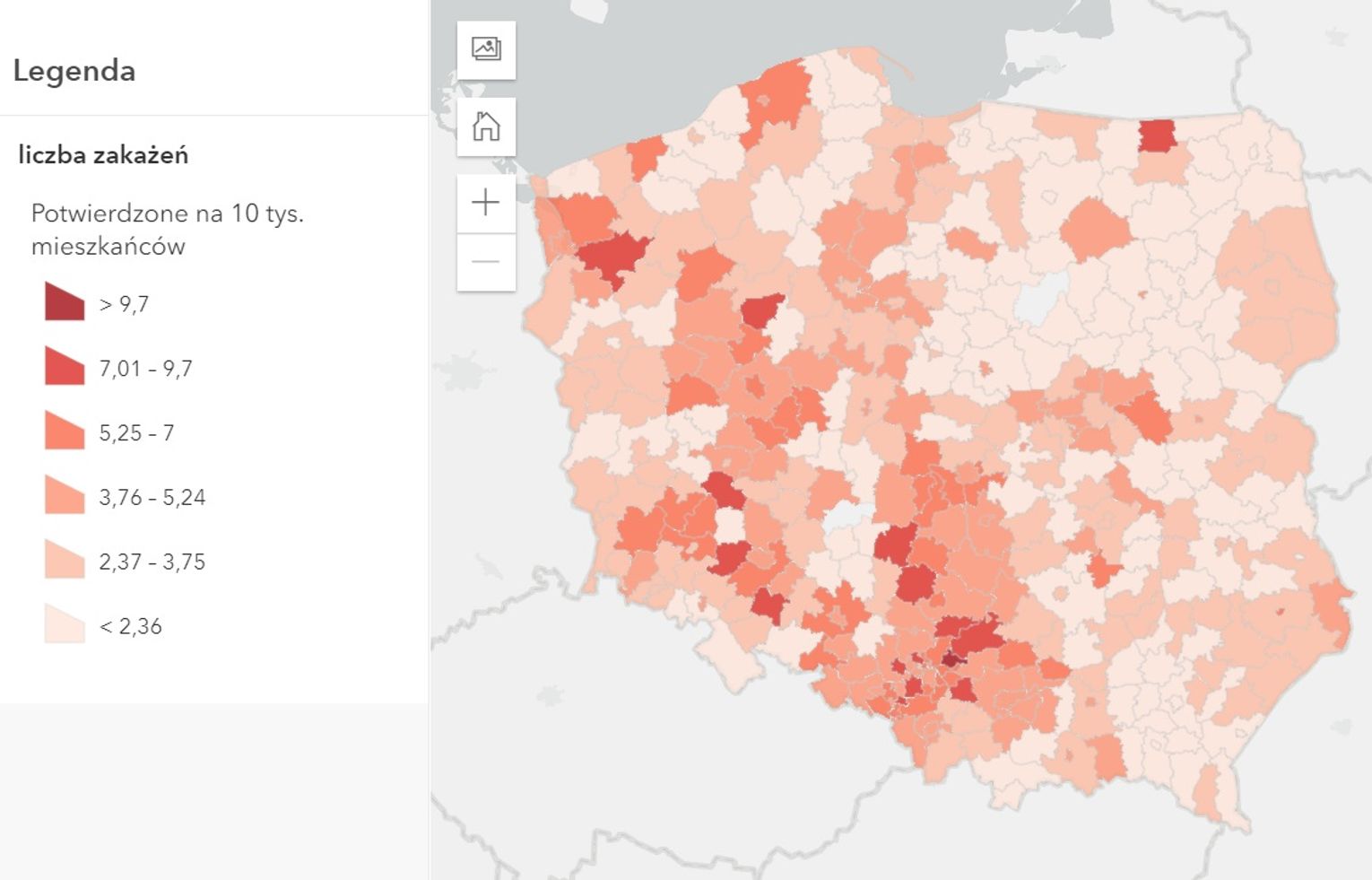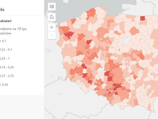 Stosunkowo wysoki w powiecie gryfińskim jest współczynnik zakażeń na 10 tys. mieszkańców. Dzisiaj wynosi 3,31. W związku z tym na mapie zakażeń w Polsce nasz powiat zaznaczony jest nieco ciemniejszym kolorem.