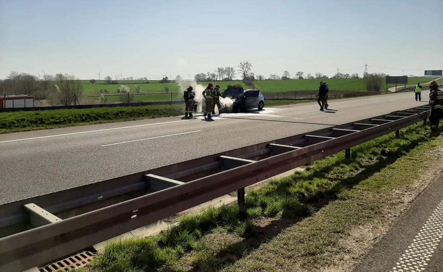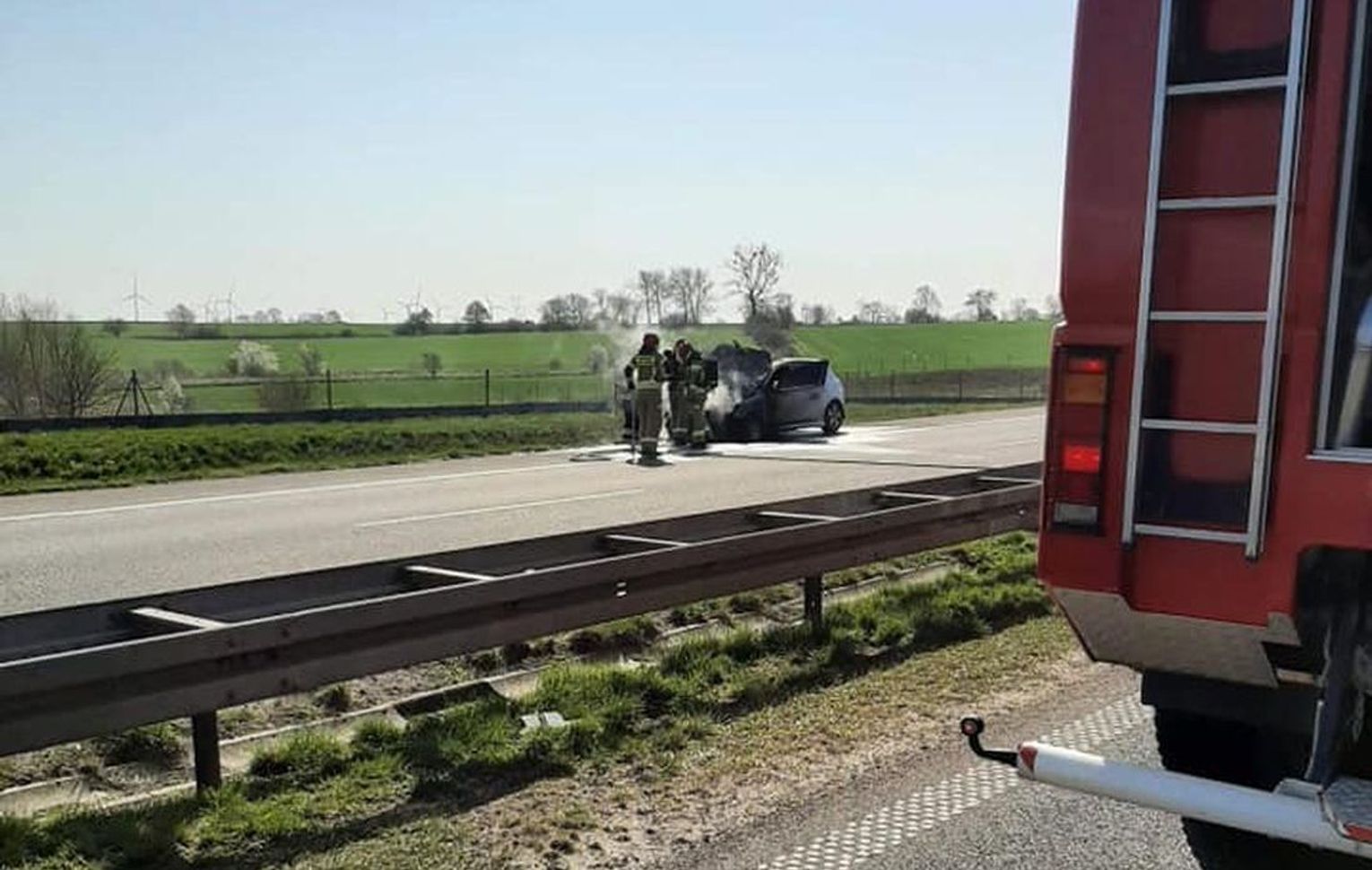 Dzisiej (21 kwietnia 2021 r.) o godzinie 9:58 stanowisko kierowania Komendy Powiatowej Państwowej Straży Pożarnej w Gryfinie zadysponowało strażaków do pożaru samochodu osobowego na drodze ekspresowej S3 w stronę Szczecina między miejscowościami Sobieradz a Drzenin.