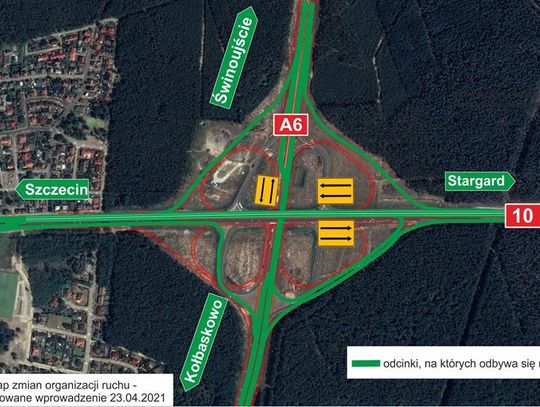 W czwartek, 22 kwietnia, planowane jest zamknięcie jezdni DK10 w stronę Stargardu. Ruch w obu kierunkach zostanie skierowany na jezdnię w stronę Szczecina po nowym wiadukcie, który został już wykonany w ramach wcześniejszych etapów robót. Następnie w piątek (23 kwietnia), planowane jest zamknięcie jezdni autostrady A6 w stronę Kołbaskowa. Ruch będzie się odbywał w obu kierunkach jezdnią przeciwległą (w stronę Gdańska/Świnoujścia). W związku z tymi zmianami zostanie również na węźle zamknięta relacja Świnoujście - Stargard.
