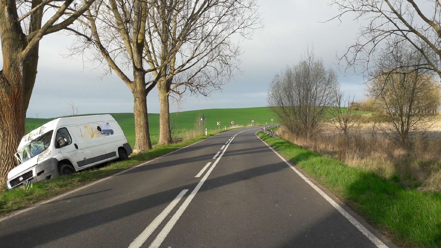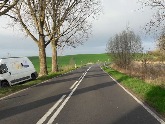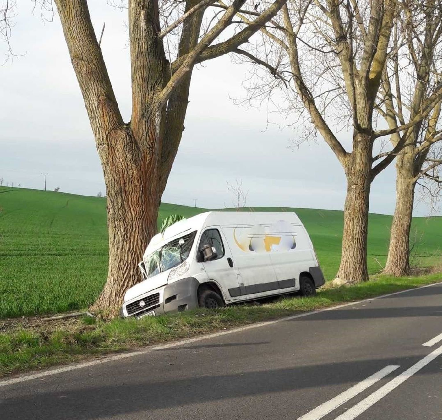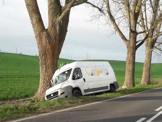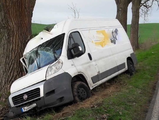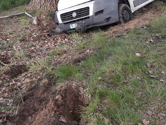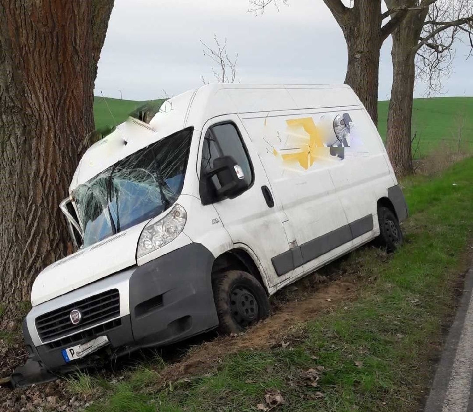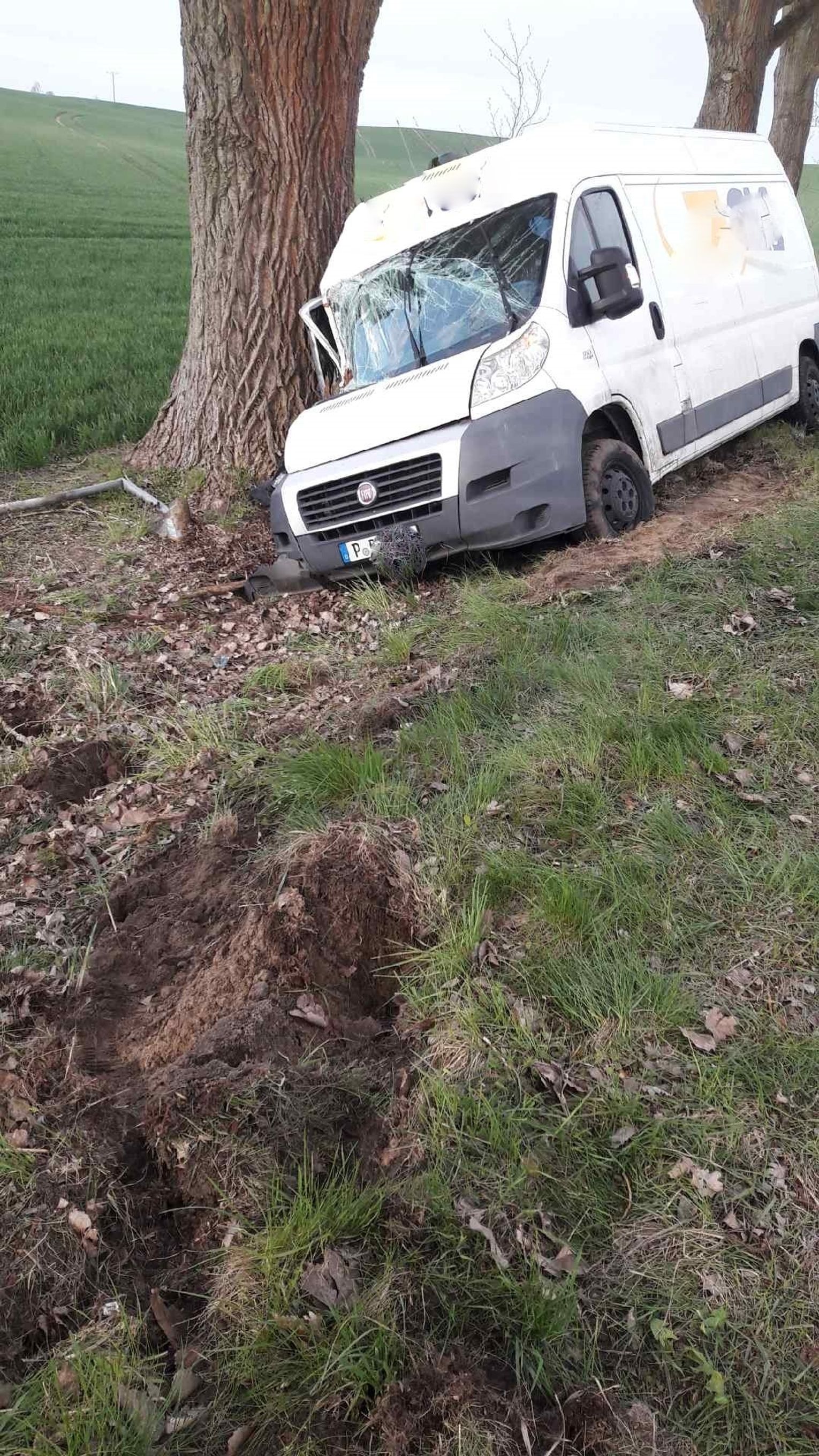 Kierowca busa marki Fiat stracił panowanie nad kierownicą, zjechał do rowu i uderzył w drzewo. To bus jednej z firm kurierskich. Samochód jest na niemieckiej rejestracji. Tymi busami często jeżdżą też polscy kierowcy.