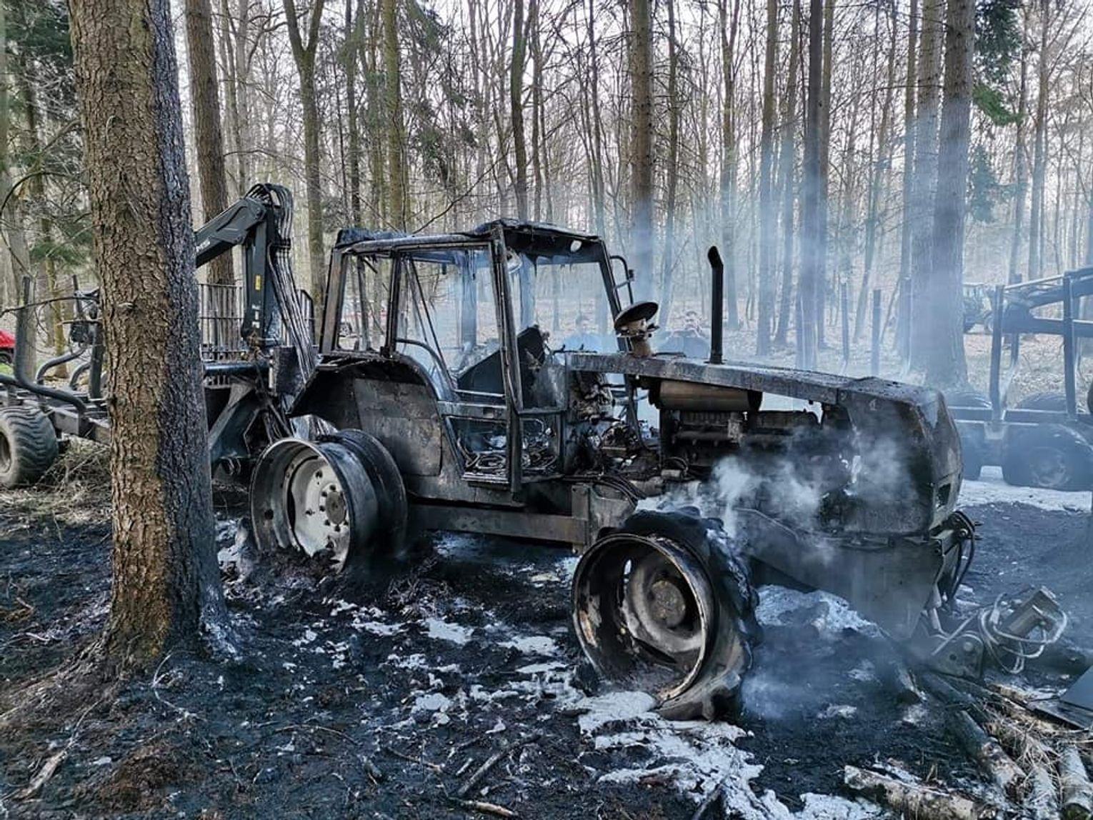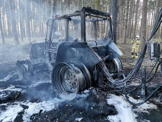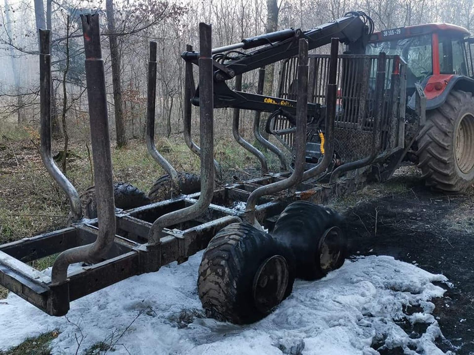Spaleniu uległ jeden ciągnik oraz wózki do drzewa. Strażacy uratowali drugi ciągnik - informują druhowie z Bań.