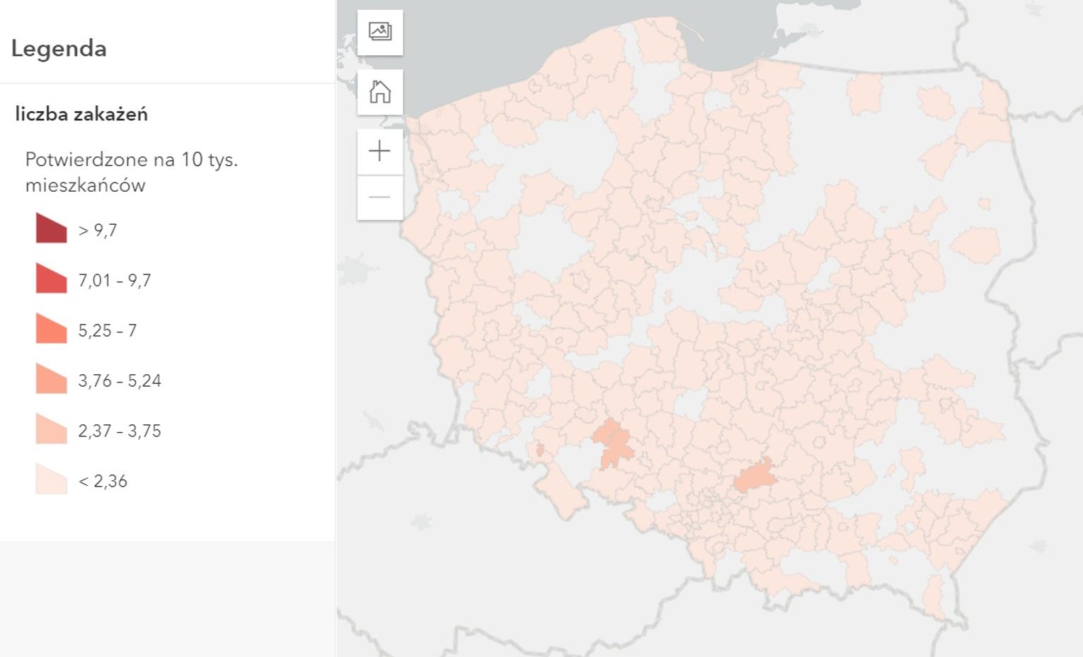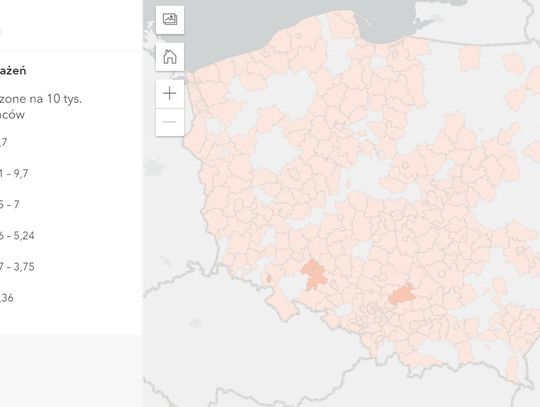 Niższy w powiecie gryfińskim jest współczynnik zakażeń na 10 tys. mieszkańców. Dzisiaj wynosi 0,61. W związku z tym na mapie zakażeń w Polsce nasz powiat zaznaczony jest nieco jaśniejszym kolorem.