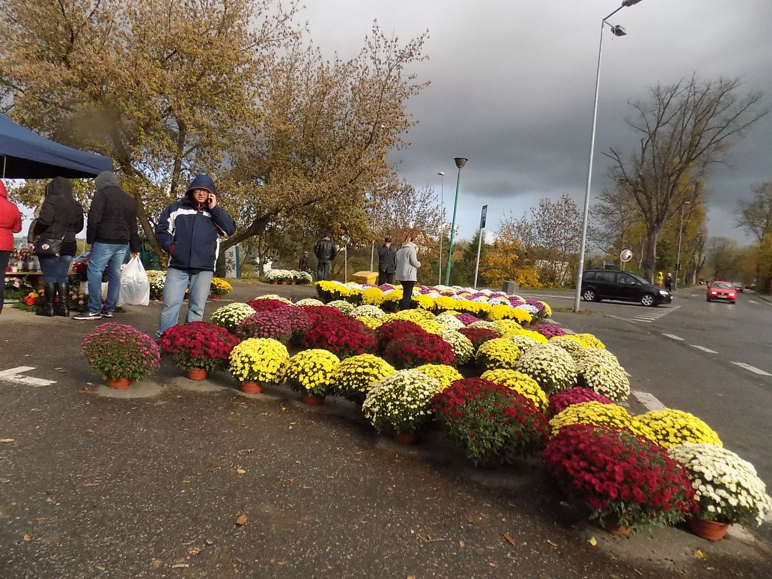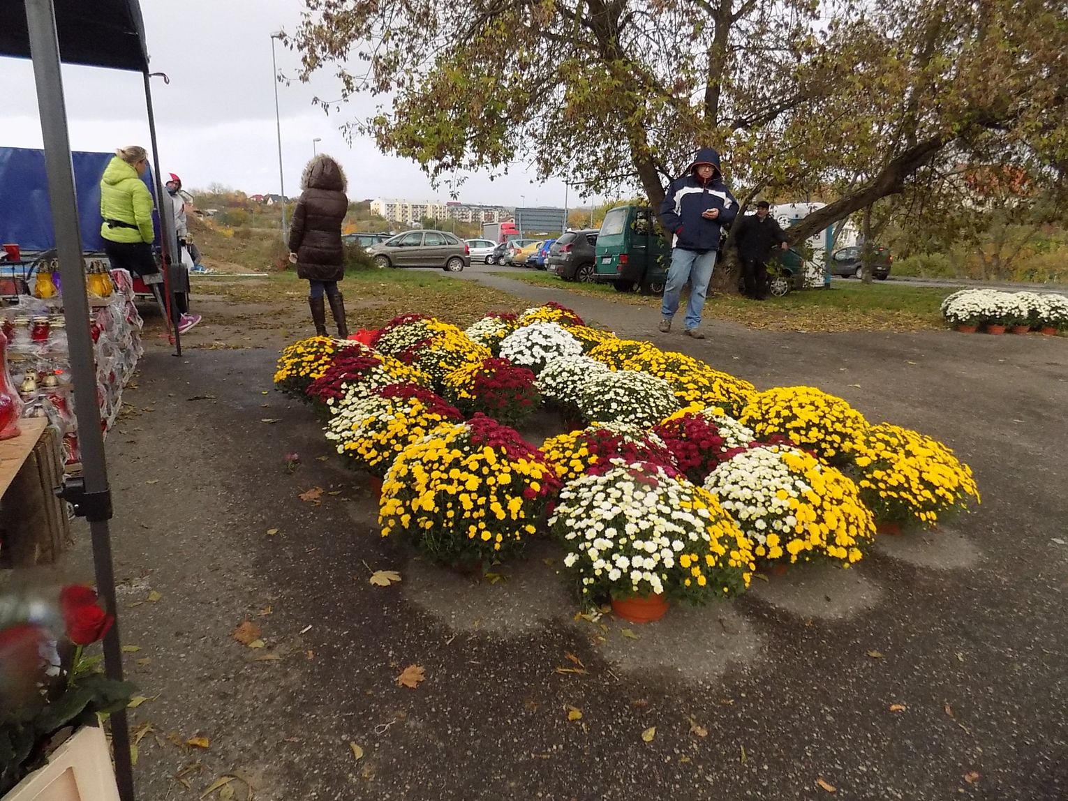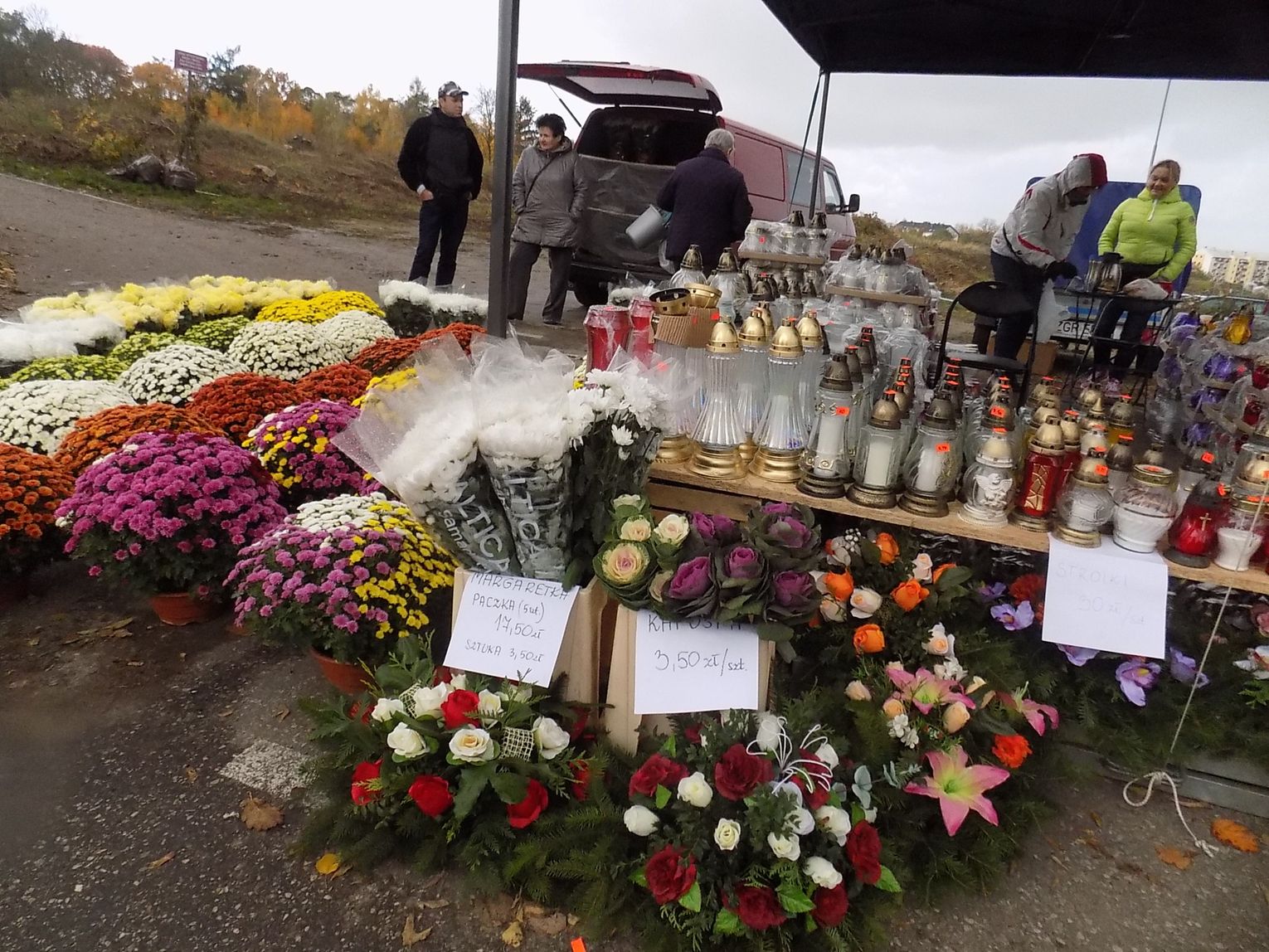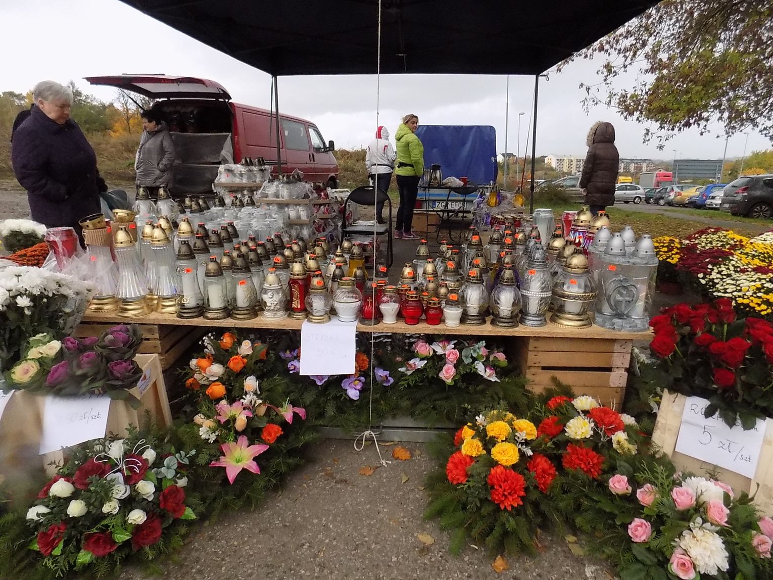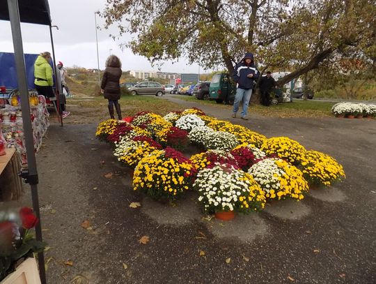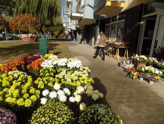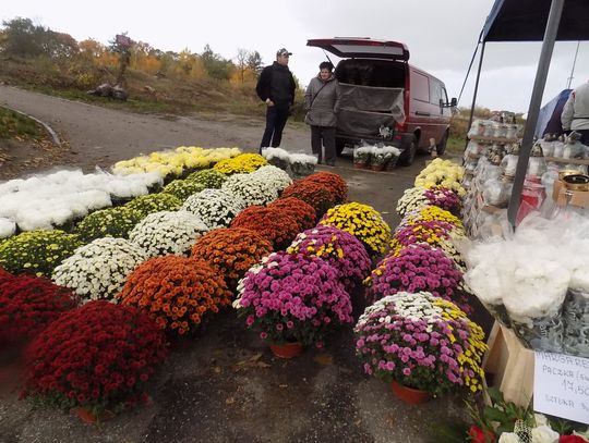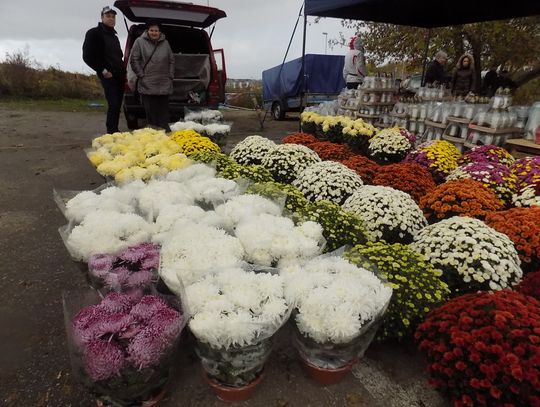 Najchętniej kupowane są białe i różnokolorowe. Cena od 8 do 20 zł w zależności od wielkości. Żywe, cięte czerwone róże po pięć zł sztuka. Zniczy też tutaj na razie tylko jeden stragan. Jutro będzie więcej. Ruch również ruch będzie większy.