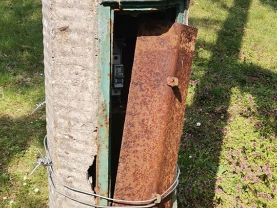 Mieszkaniec gminy Gryfino przysłał zdjęcie, na którym widać prowizorycznie wykonaną osłonę uszkodzonego słupa. Blacha jest już zardzewiała, wyszczerbiona, z wyłamanymi wkrętami. Na słupie trzyma się jedynie dzięki... obwiązaniu drutem.