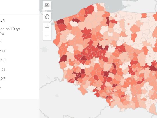 Nieco wyższy w powiecie gryfińskim jest współczynnik zakażeń na 10 tys. mieszkańców. Dzisiaj wynosi 1,47. W związku z tym na mapie zakażeń w Polsce nasz powiat zaznaczony jest nieco ciemniejszym kolorem.