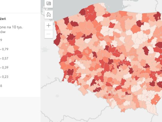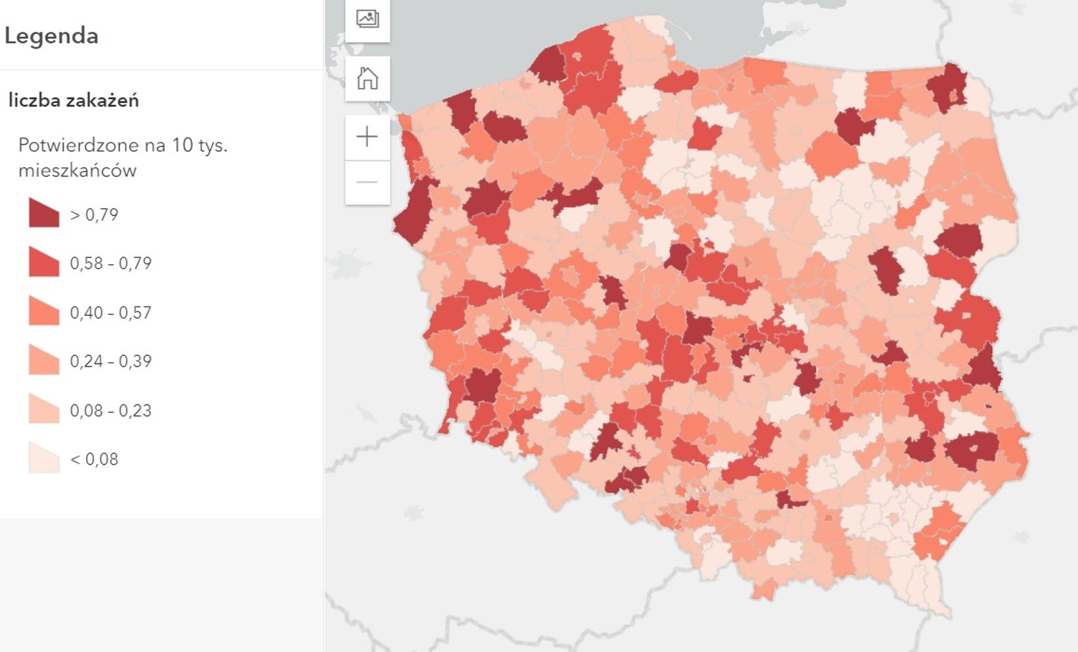 Wyższy niż wczoraj w powiecie gryfińskim jest współczynnik zakażeń na 10 tys. mieszkańców. Dzisiaj wynosi 1,10. Na mapie zakażeń w Polsce nasz powiat zaznaczony jest ciemnym kolorem.