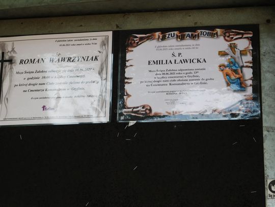Zarówno pogrzeb śp. Emilii Ławickiej, jak i Romana Wawrzyniaka odbędzie się we wtorek 8 czerwca 2021 r. w Gryfinie.