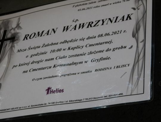 Msza święta za Romana Wawrzyniaka odprawiona zostanie o godz. 10 w kaplicy cmentarnej na Cmentarzu Komunalnym w Gryfinie.
