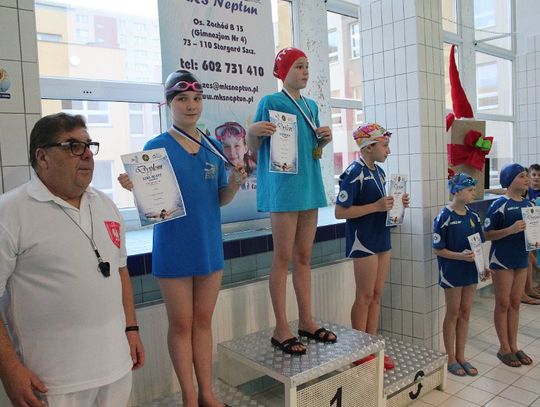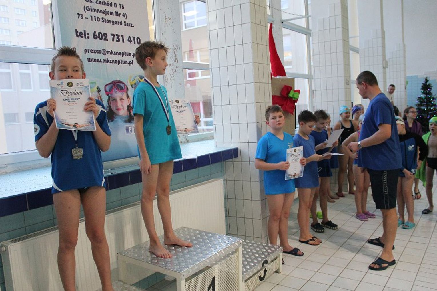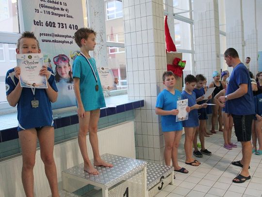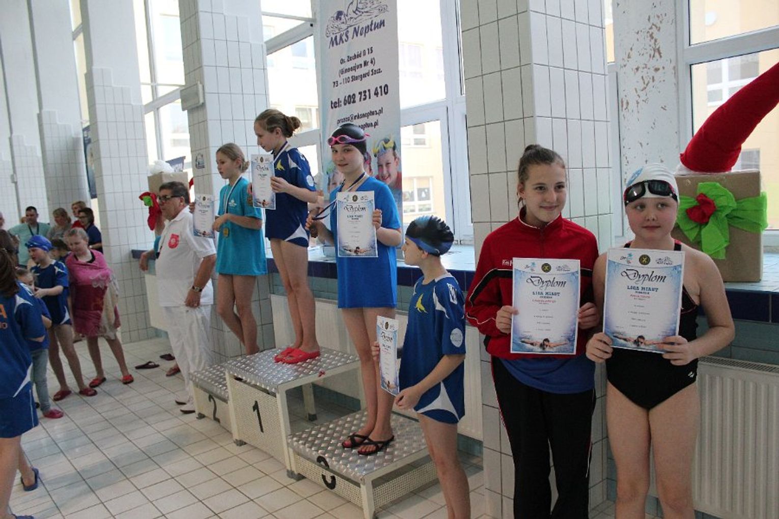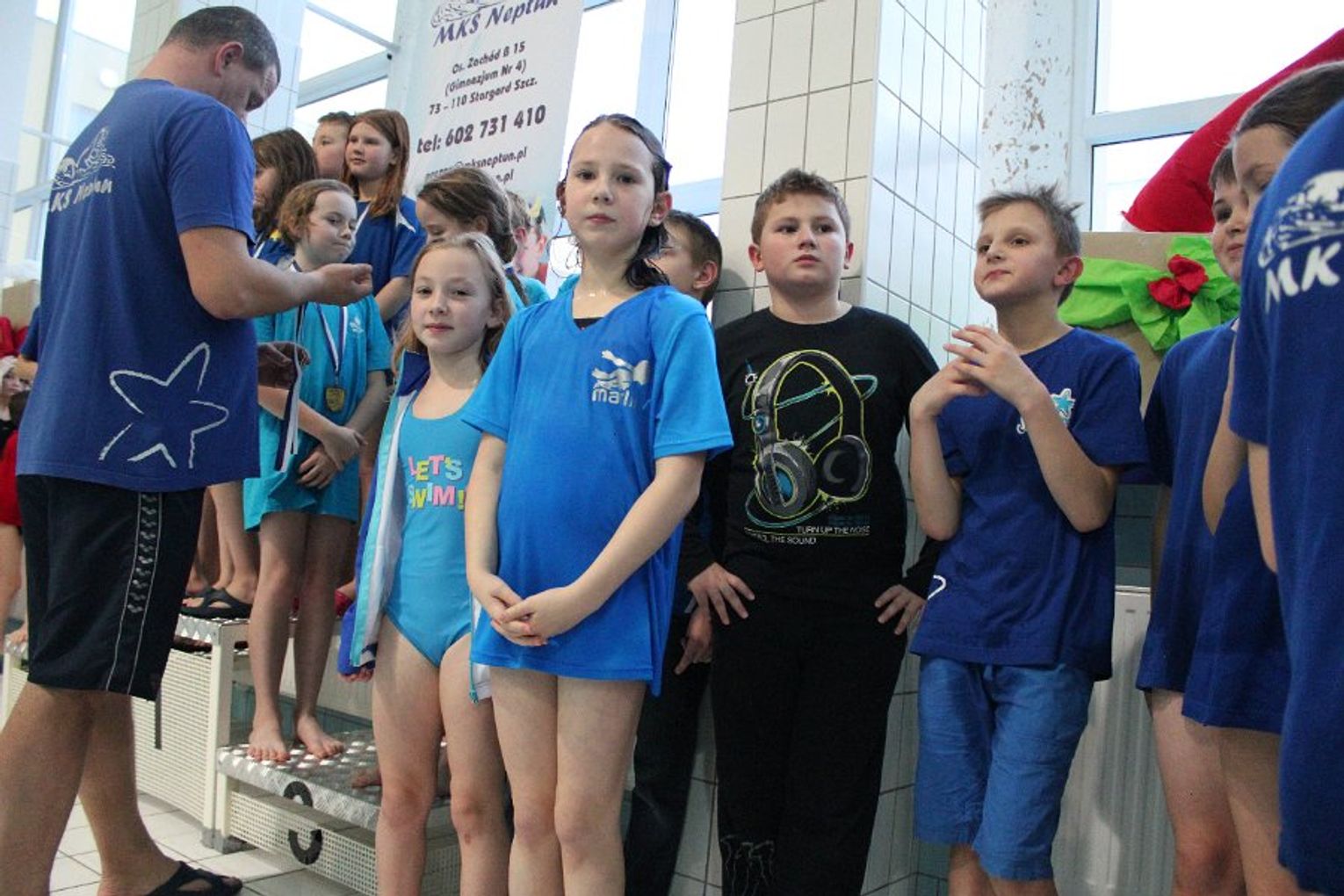 Bardzo dobrze popłynęły nasze sztafety, na dystansie 4x50m stylem dowolnym. W kategorii 10 lat sztafeta w składzie: Michał Mężyński, Zuzanna Zawada, Hanna Zielińska i Nel Brzeskot wywalczyła 4 miejsce. Również, na 4 miejscu, ale w kategorii 9 lat i młodsi dopłynęła sztafeta w składzie: Jacek Wodzyński, Celestyna Szulc, Aleksandra Szewczuk i Mateusz Rozmiarek. Zaś druga nasza sztafeta, w tej kategorii, w składzie: Jagoda Kujawa, Adrianna Gniłka, Weronika Małolepsza i Jakub Jastrowicz dopłynęła na 6 miejscu.