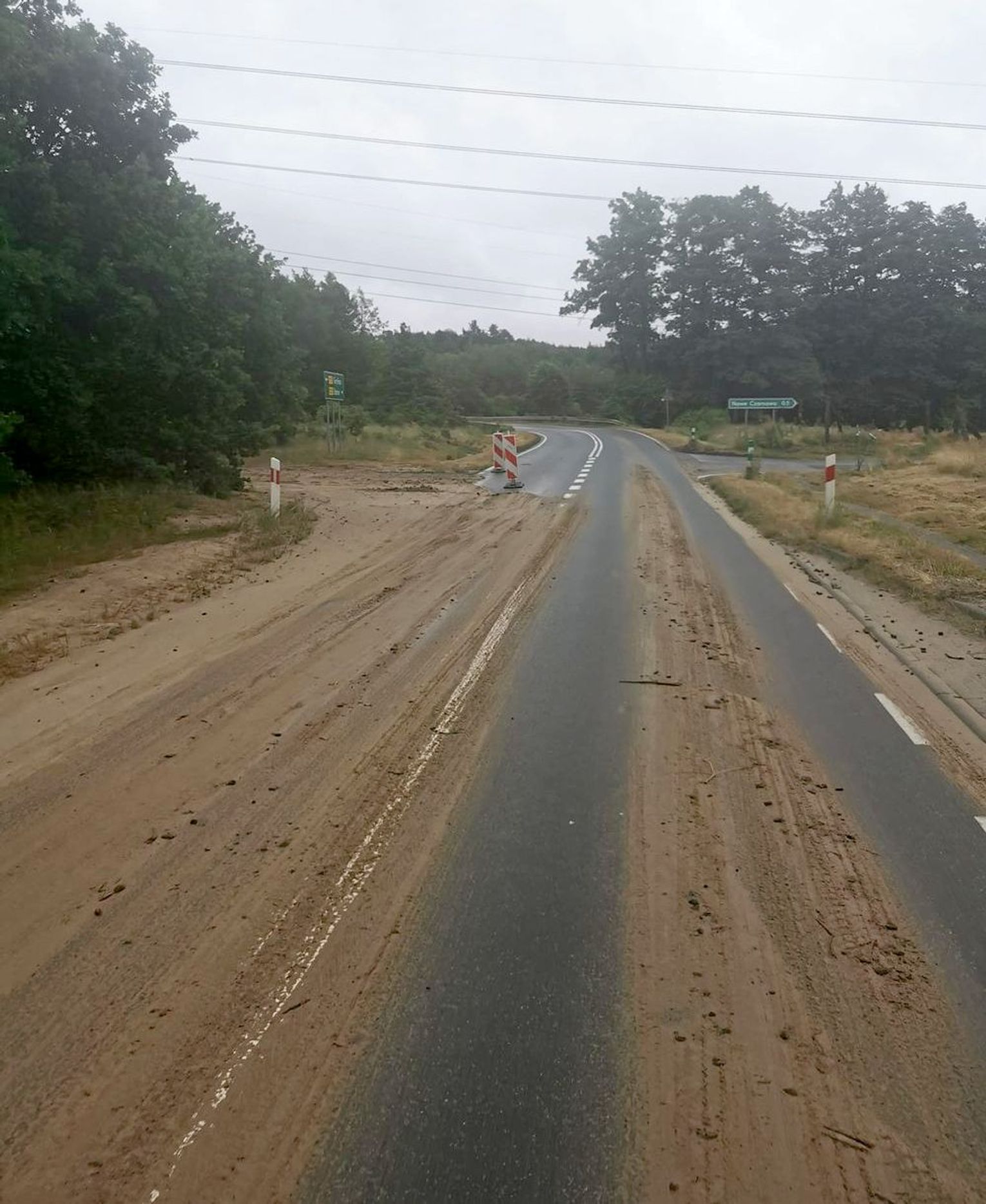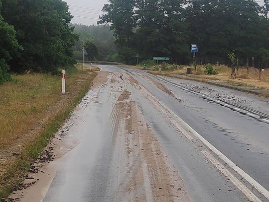Tak wygląda droga na końcu Pniewa w kierunku Steklna. Są koleiny i błoto, można łatwo wpaść w poślizg. W Radziszewie czyszczona jest droga z mokrego piachu. Kierowcy, zwolnijcie!