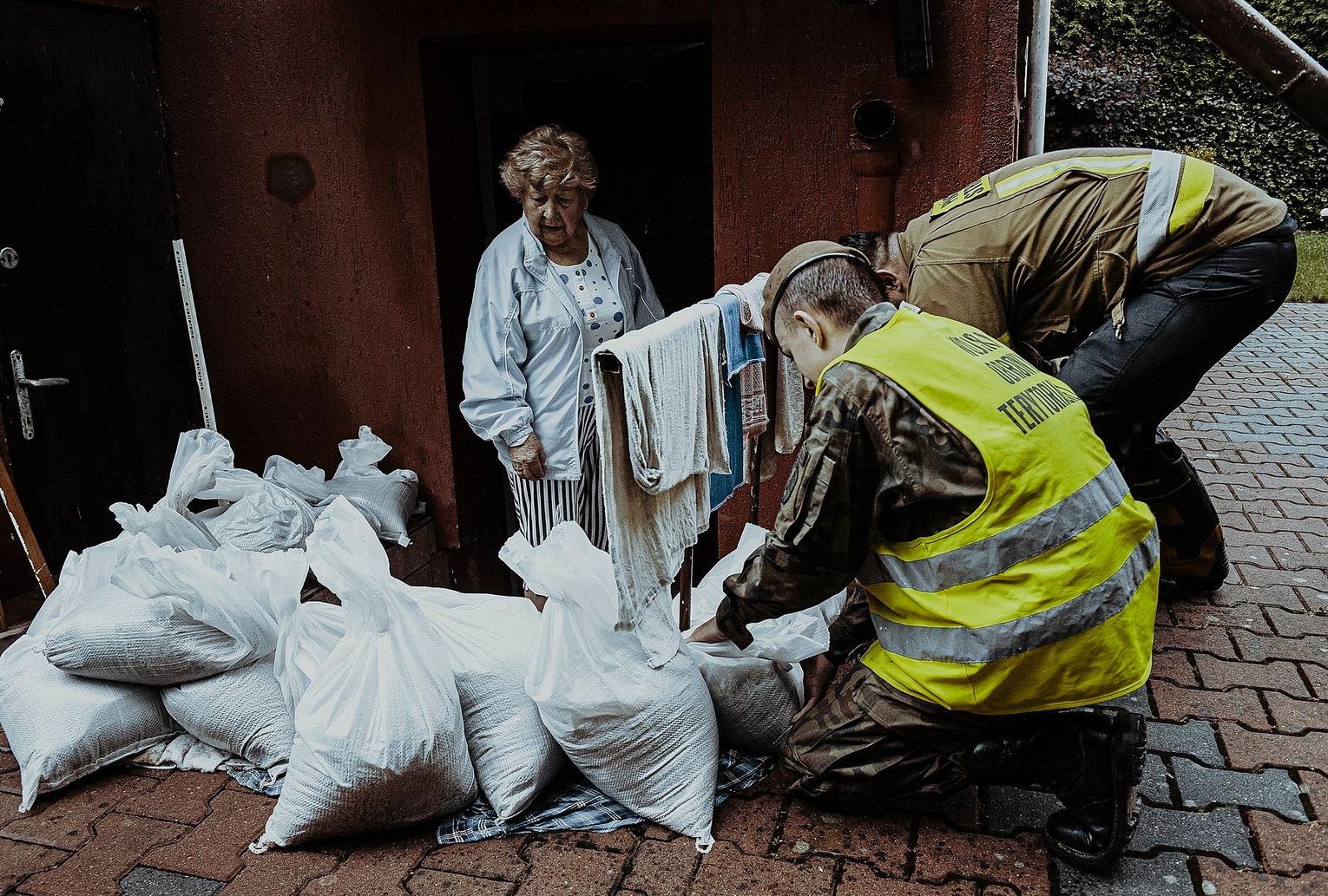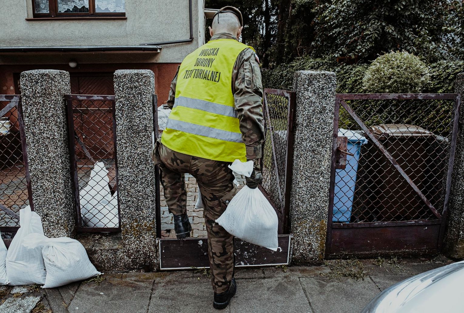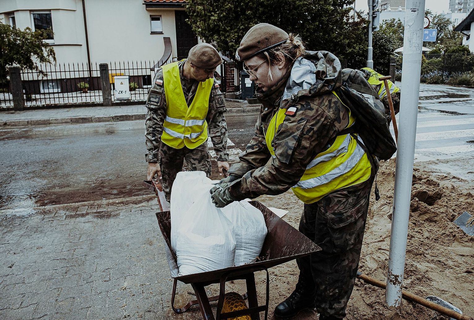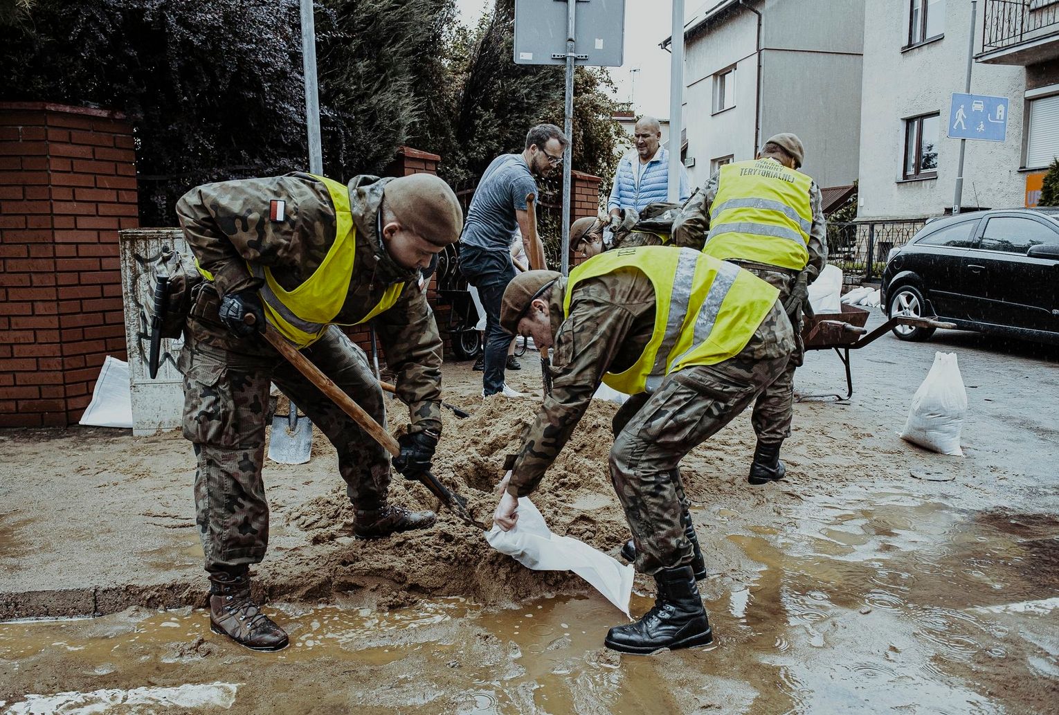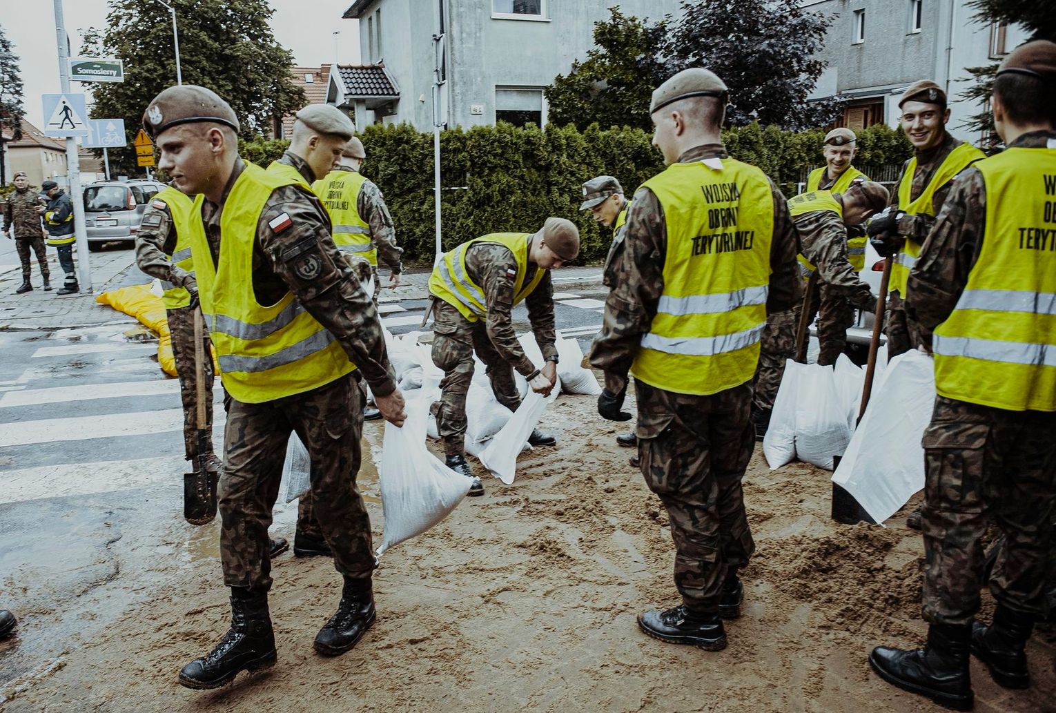 Na os. Samosierry, gdzie sytuacja była najtrudniejsza, terytorialsi budowali zapory z worków z piaskiem, by kanalizować płynącą wodę. Żołnierze pomagali też mieszkańcom ratować zalany dobytek. W piwnicach domów, gdzie znajdowały się biura, „pływał” nawet sprzęt komputerowy a tablice rejestracyjne z aut, wyrwane przez strumień wody rozrzucone były po ulicach. Późny południem, kiedy woda wreszcie opadła, żołnierze mogli wreszcie usunąć postawione zapory z worków. Wojsko wynosiło też z zalanych garaży sprzęt gospodarczy, pomagali strażakom wypompowywać wodę z podtopionych pomieszczeń.