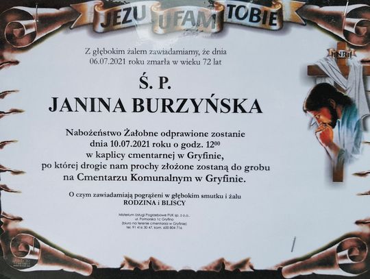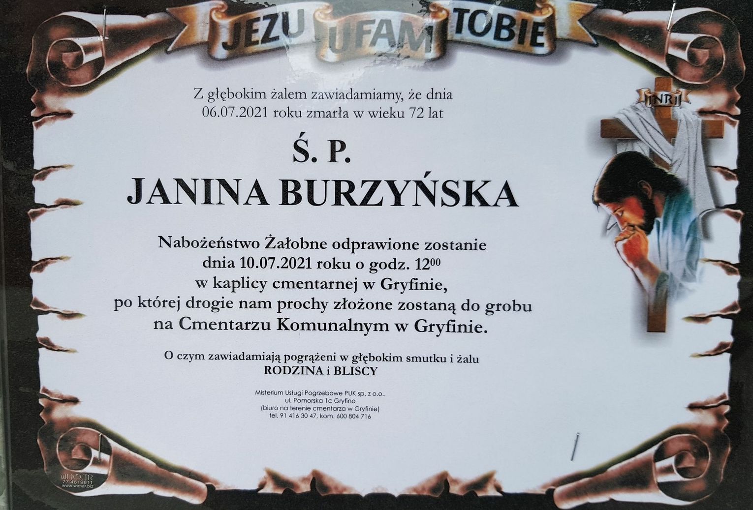 Janina Burzyńska (pogrzeb w sobotę o godz. 12) - lat 72